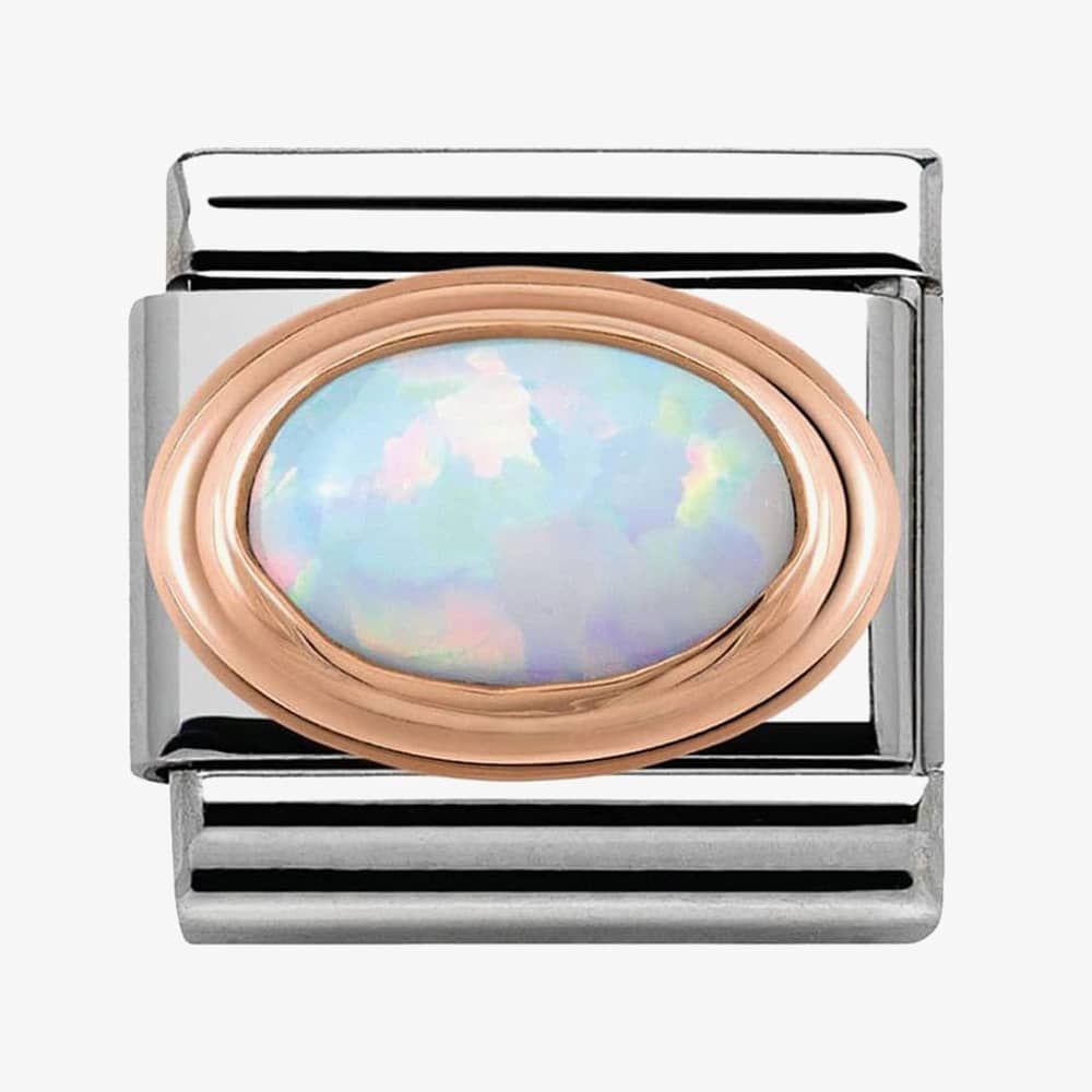 Adorn your favourite Nomination bracelet with this gorgeous stainless steel charm featuring a beautiful 9ct rose gold plated design finished with a white opal stone. A wonderful charm perfect for creating a combination to truly suit your style.