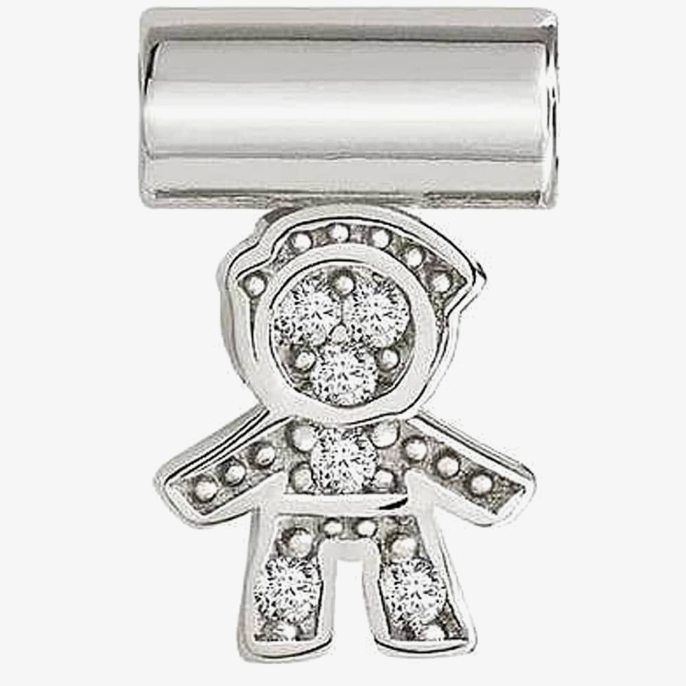 Adorn your outfit with this gorgeously crafted sterling silver Nomination pendant. Consisting of a baby boy studded with sparkling cubic zirconia stones on a barrel design which threads onto your Nomination chain. Sterling silver items are rhodium treated to prevent tarnishing.