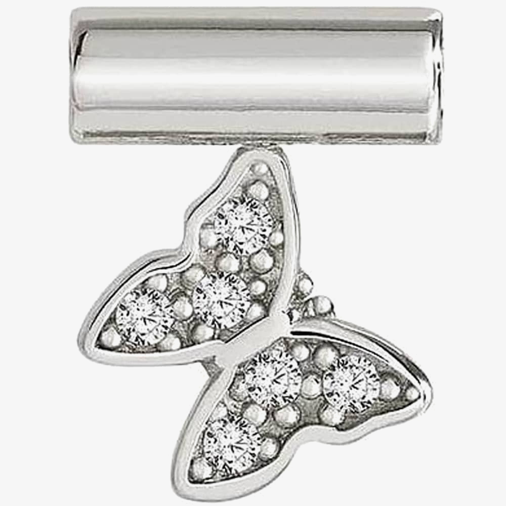 Adorn your outfit with this gorgeously crafted sterling silver Nomination pendant. Consisting of a butterfly studded with sparkling cubic zirconia stones on a barrel design which threads onto your Nomination chain. Sterling silver items are rhodium treated to prevent tarnishing.