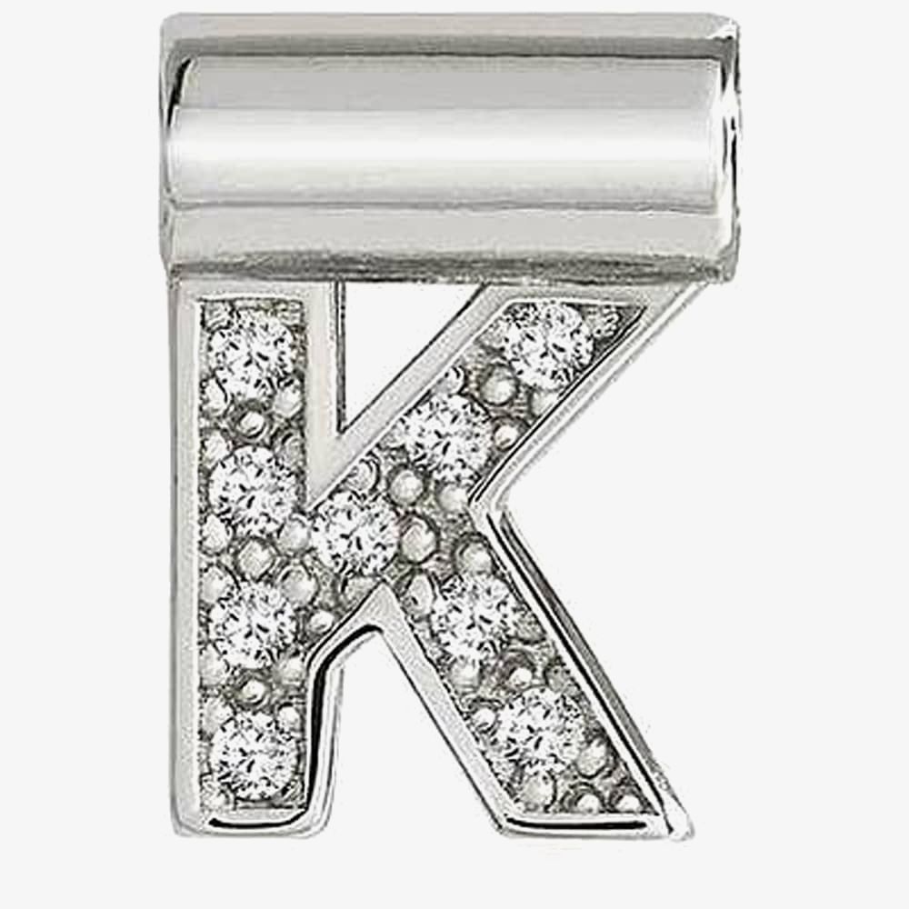 A stylishly crafted Nomination pendant which consists of the letter K crafted from sterling silver material. Adorned with a collection of cubic zirconia stones to add extra sparkle. Add this to your Nomination necklace using the barrel which threads on to a chain. Sterling silver items are rhodium treated to prevent tarnishing.