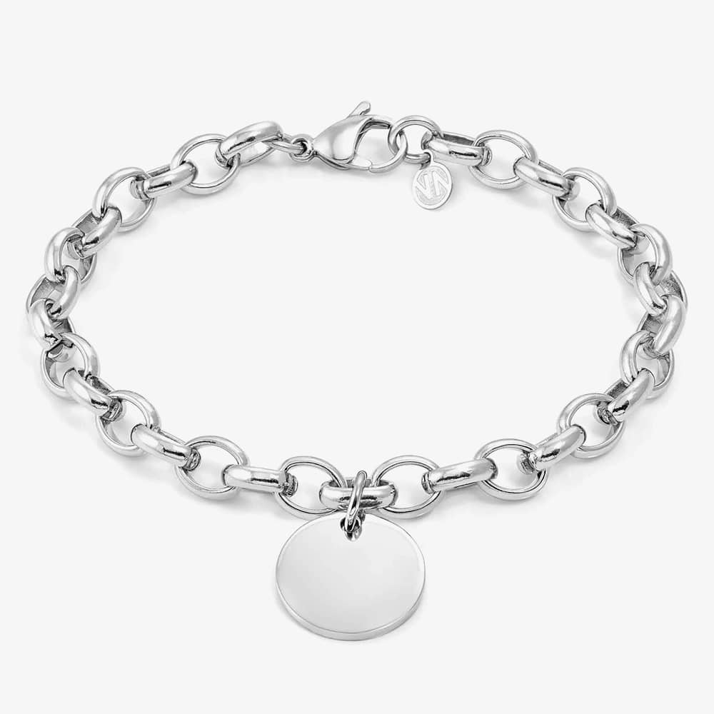 This stainless-steel bracelet features a plain round disc. Crafted for durability and elegance, it's a versatile accessory perfect for any occasion. Add a personal touch with engraving, making it a cherished keepsake or a heartfelt gift.