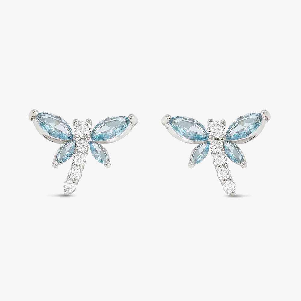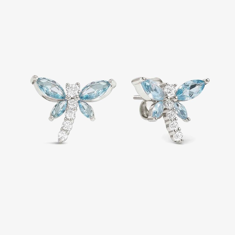 Elegant Nomination stud earrings crafted from sterling silver, featuring delicate dragonfly designs adorned with shimmering multi-cut cubic zirconia stones in dazzling blue and white. A perfect touch of charm and sophistication.