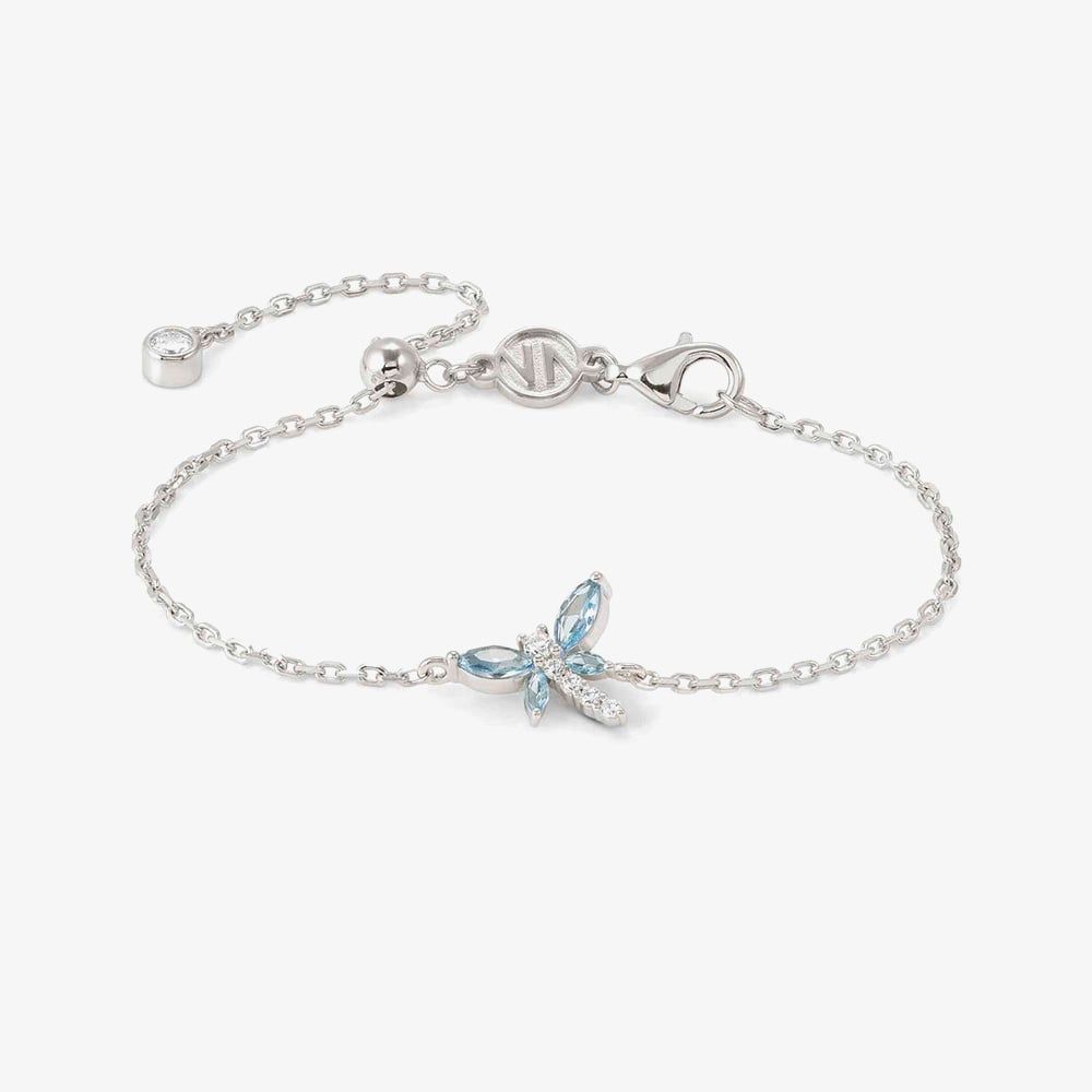 The Nominations Shine Me Up Collection sterling silver bracelet features a charming dragonfly design, adorned with mixed cut blue and white cubic zirconia stones, on a delicate trace chain with a lobster clasp, adding a touch of elegance and sparkle.