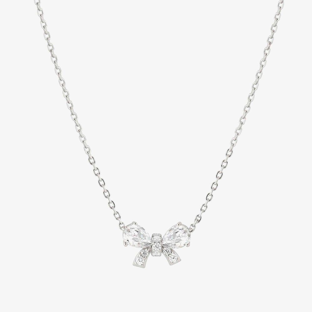 The Nominations Shine Me Up Collection sterling silver necklet features a delicate bow pendant adorned with sparkling cubic zirconia stones, adding a touch of elegance and charm.