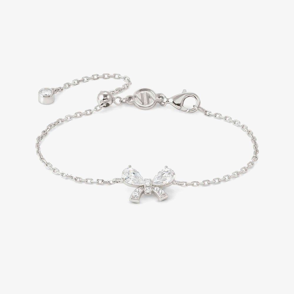 The Nominations Shine Me Up Collection sterling silver bracelet features a charming bow design, adorned with mixed cut white cubic zirconia stones, on a delicate trace chain with a lobster clasp, adding a touch of elegance and sparkle.