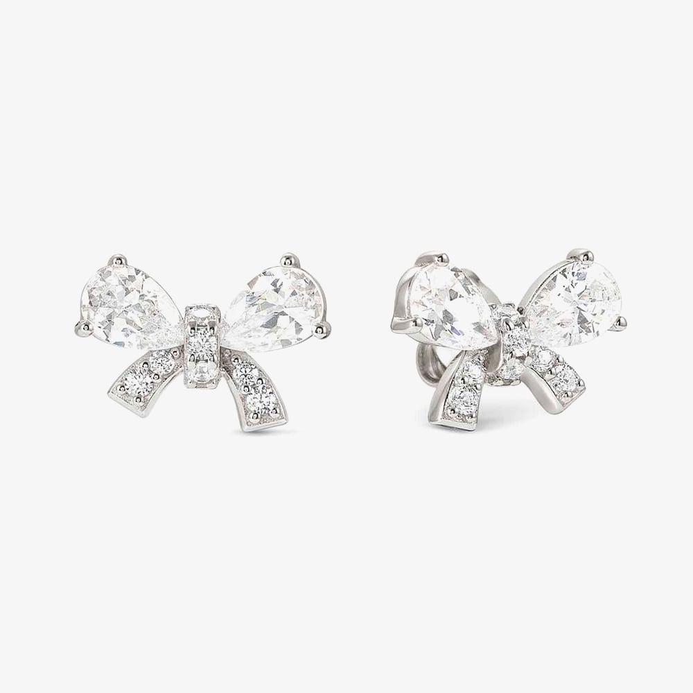 The Nominations Shine Me Up Collection sterling silver stud earrings feature delicate bow designs adorned with a mix of cut cubic zirconia stones, adding a touch of sparkle and elegance.