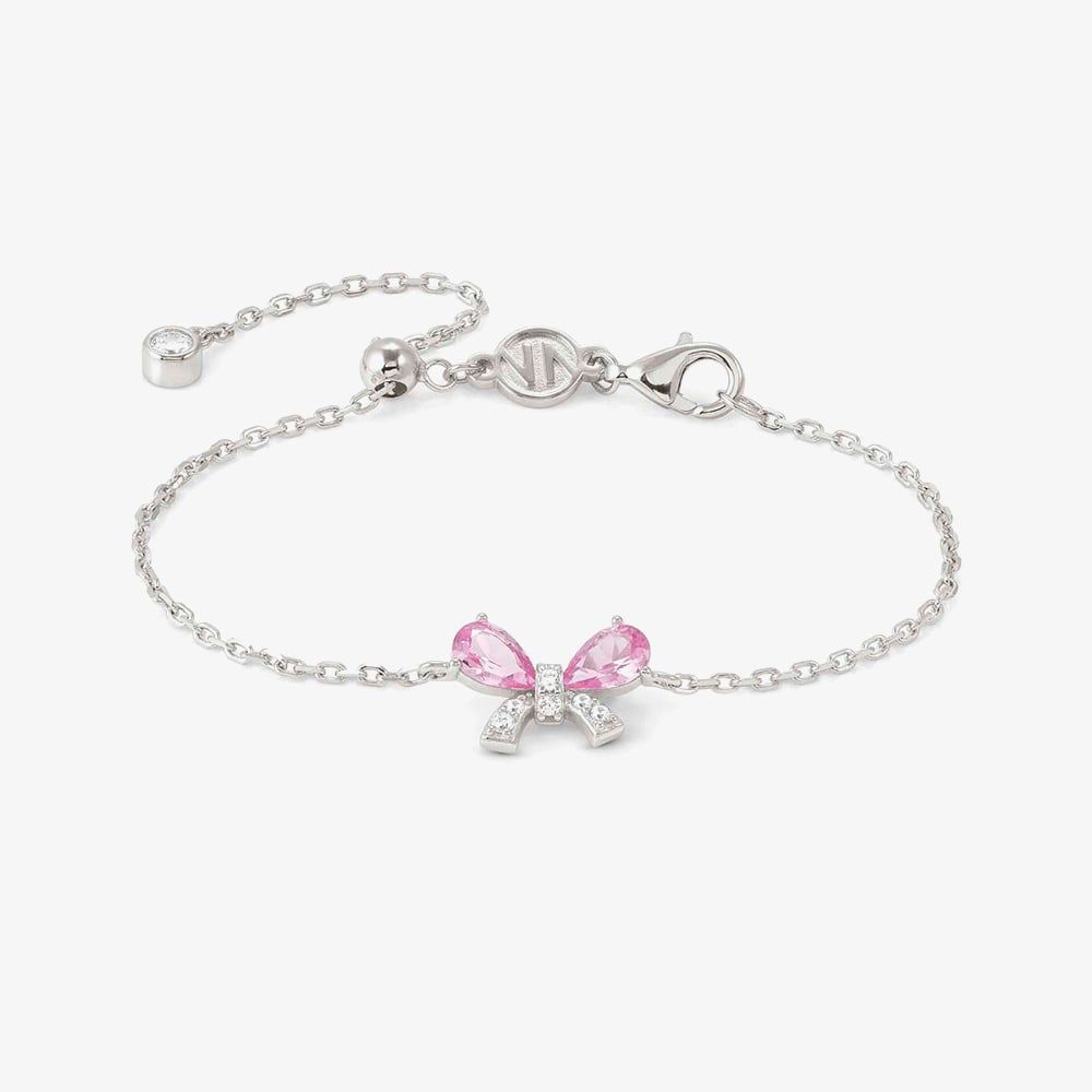 The Nominations Shine Me Up Collection sterling silver bracelet features a charming bow design, adorned with mixed cut pink and white cubic zirconia stones, on a delicate trace chain with a lobster clasp, adding a touch of elegance and sparkle.