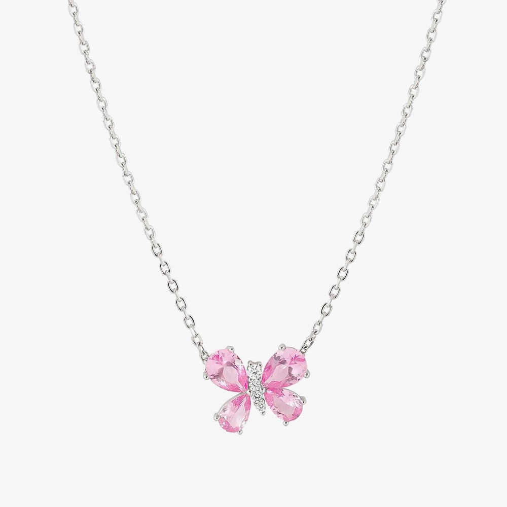 The Nominations Shine Me Up Collection sterling silver necklet features a delicate butterfly pendant adorned with sparkling white and pink cubic zirconia stones, adding a touch of elegance and whimsy.