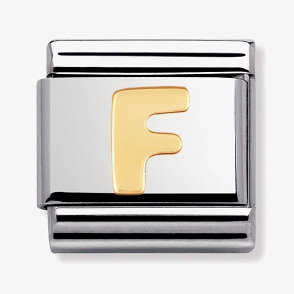 Introducing the Classic composable Letter F charm from Nomination, a great way to personalise your collection, spelling your name or special message. The stainless steel base link is adorned with a bold golden Letter F, a stylish contrast for a standout finish.