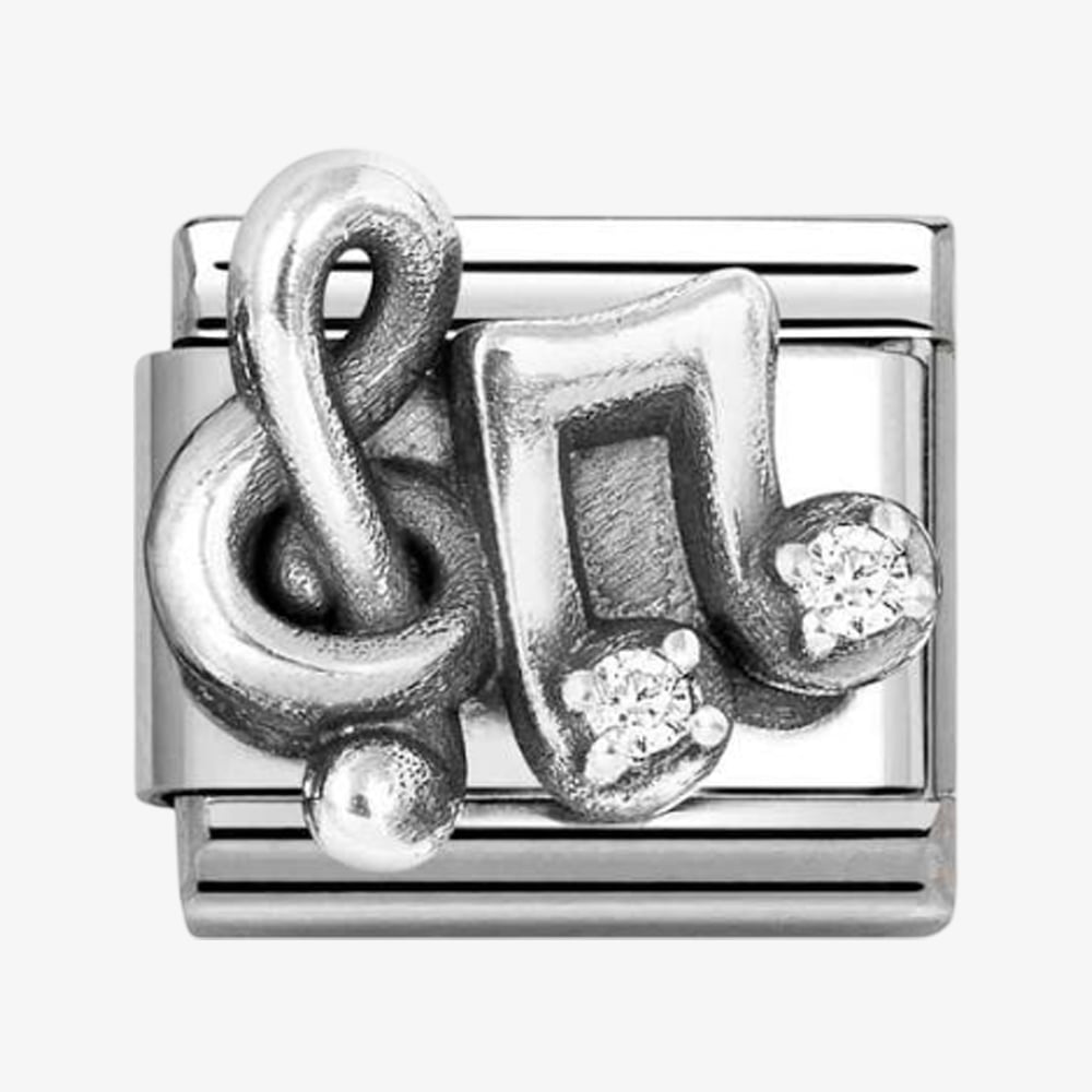 The Nomination charm is crafted from stainless steel and features two music notes, adorned with sparkling cubic zirconia stones. This harmonious and elegant charm adds a musical touch of sparkle to your bracelet.