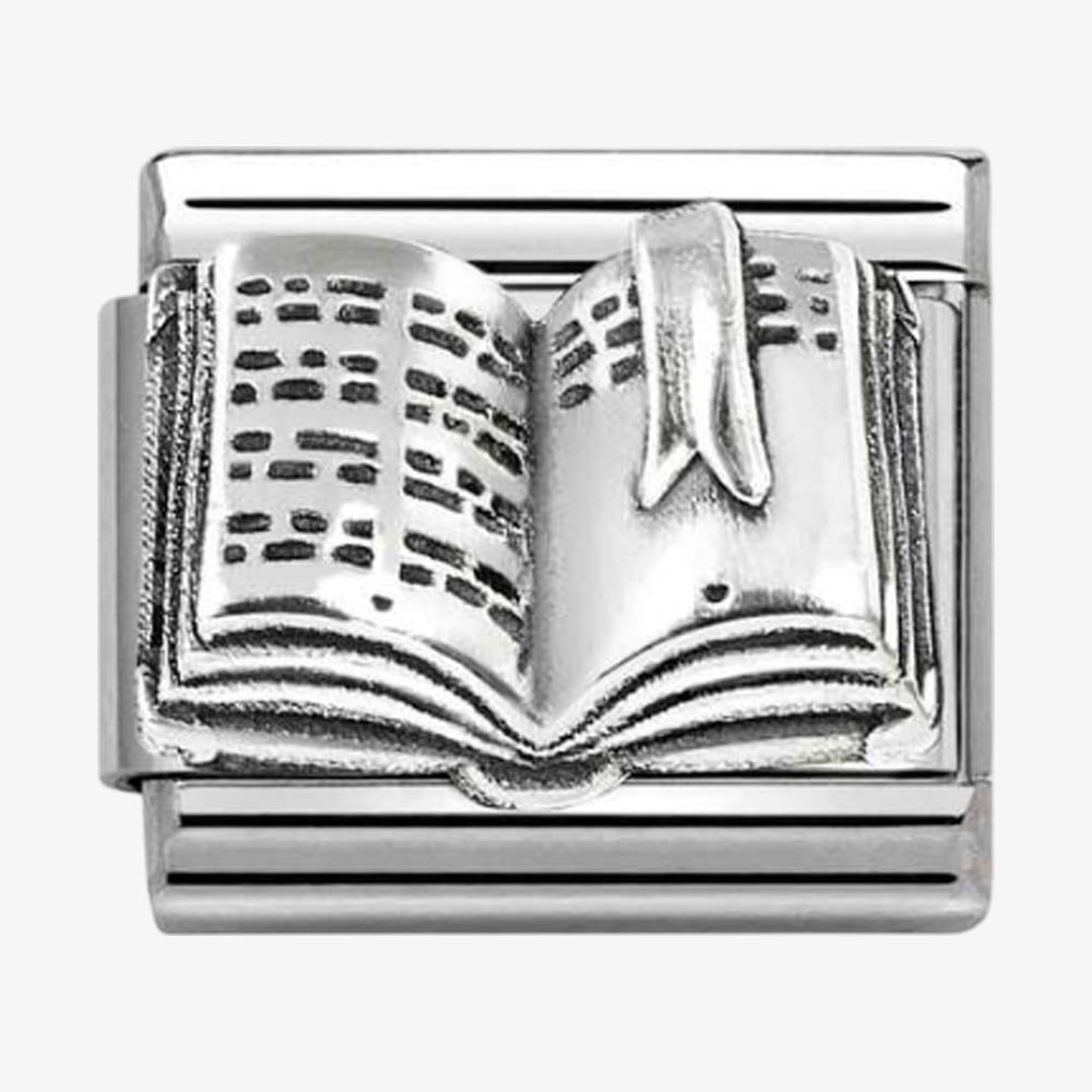 The Nomination charm is made from stainless steel and features an open book design with intricate sterling silver detailing. This elegant charm adds a literary touch and a sense of sophistication to your bracelet.