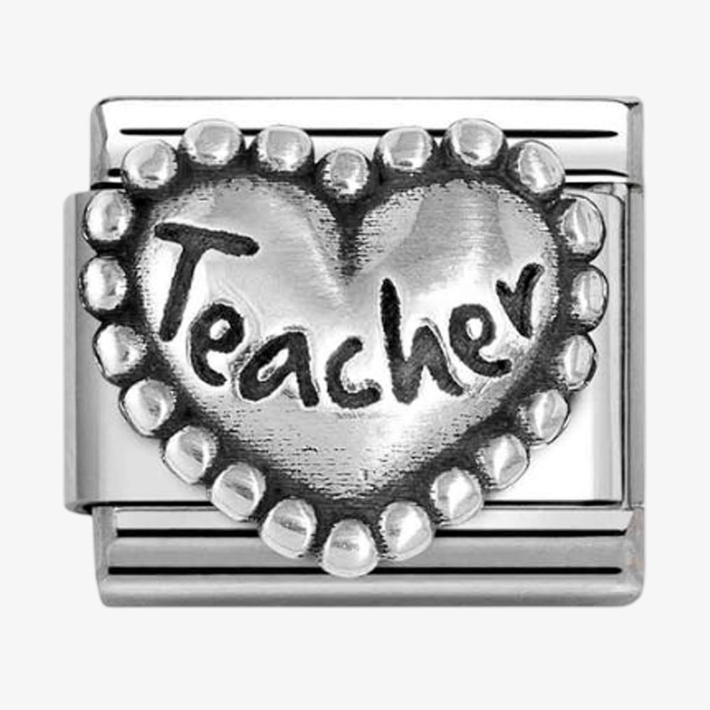 The Nomination charm is made from stainless steel and features a heart design with "TEACHER" engraved in the centre, surrounded by delicate sterling silver beads. This thoughtful and meaningful charm is a perfect tribute to a special educator.