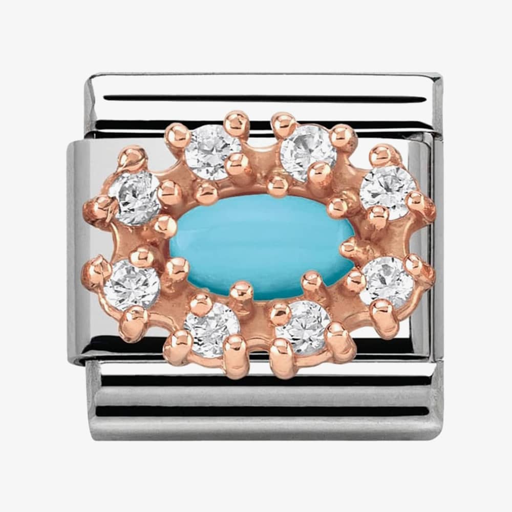 This Nomination charm features an oval shaped turquoise stone in the centre, surrounded by a collection of sparkling stones set in a rose gold plated base.