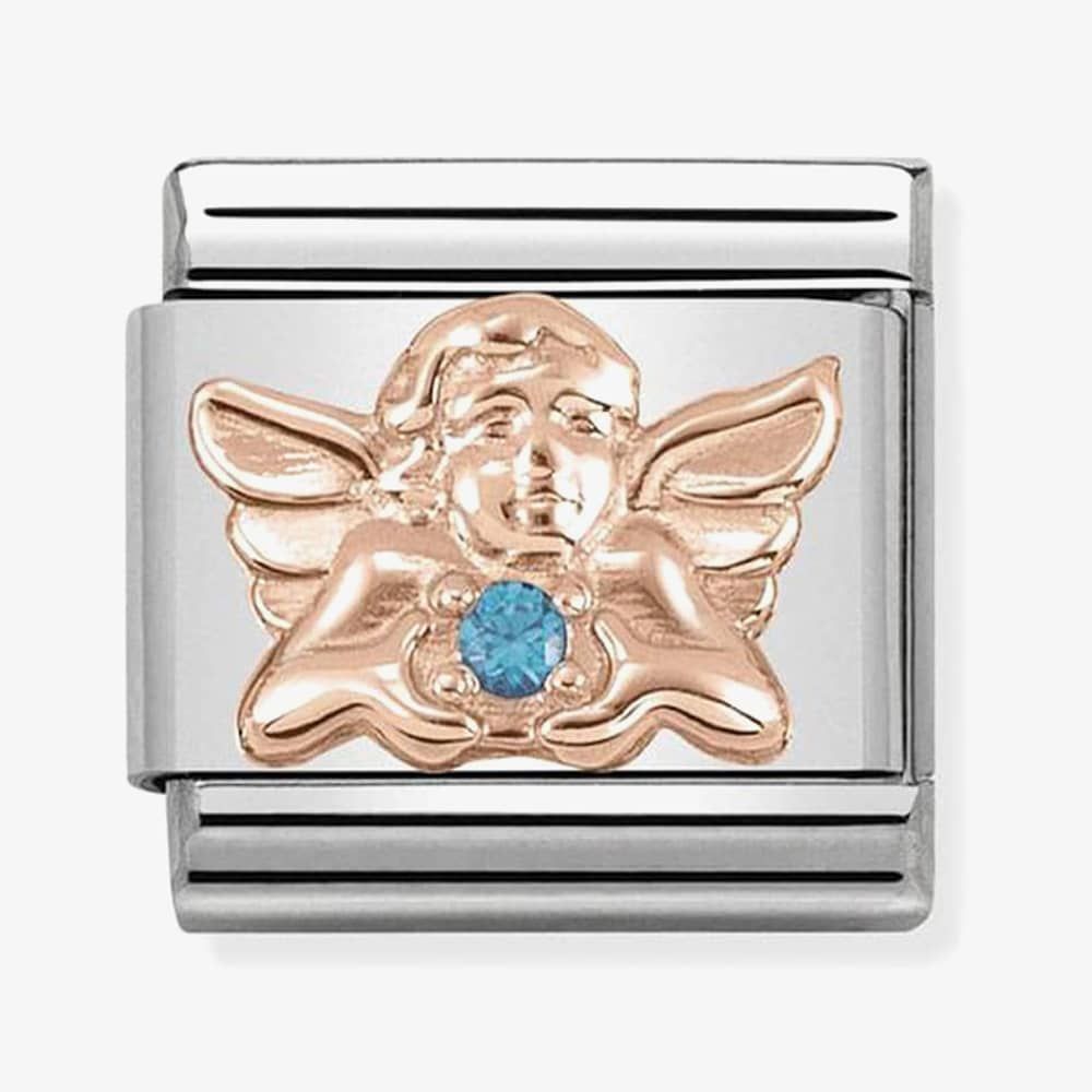 This adorable angel design comes crafted from gold plating and features the smiling angel holding a sparkling blue cubic zirconia stone in her hands.