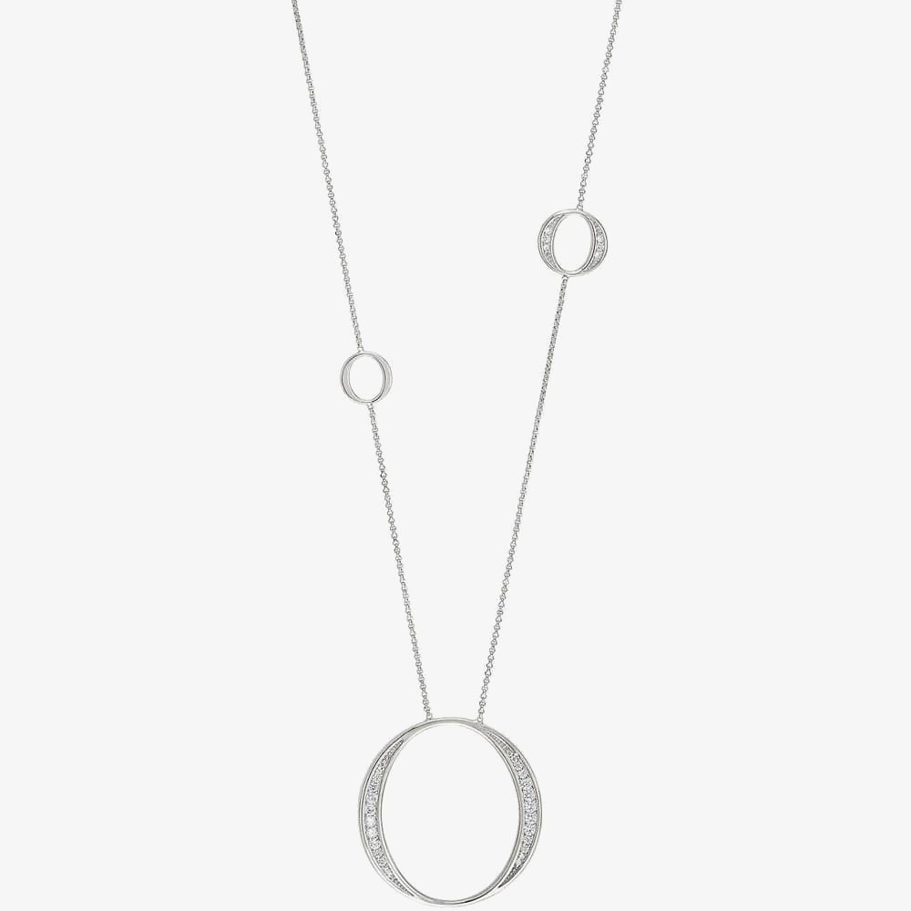 A stylish looking ladies necklace which features a collection of different sized circles set with sparkling cubic zirconia resting onto a silver chain.