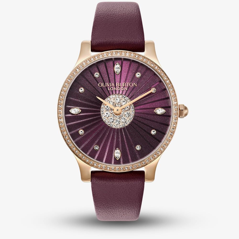 The Olivia Burton Beaulieu watch blends classic charm with contemporary sparkle, showcasing a luxurious cherry red leather strap and a textured Raven Black dial. At its center, a burst of pavé stones and a marquise-cut crystal catch the light beautifully, while the crystal-set bezel adds an elegant touch of shine, making it an effortlessly eye-catching accessory for any look.