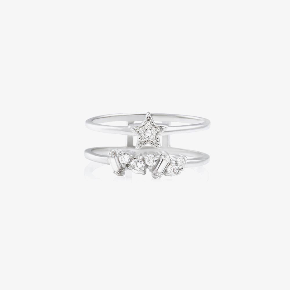 This cosmic inspired ring features a celestial star motif. The sterling silver ring features a second adjoining band that is embellished with sparking crystals that connect at the back for an open-ended style. Create the perfect gift for a loved one by pairing with the matching huggie hoop earrings and bracelet from the collection.
