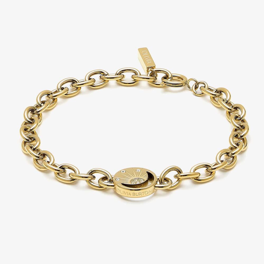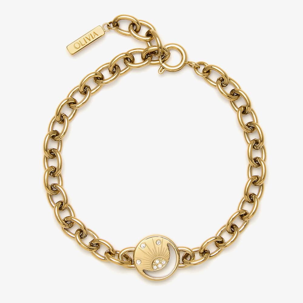 Featuring a captivating rising sun design adorned with intricate rays, it is complemented by a cut-out crescent moon and adorned with sparkling crystal stars, mirroring the sky from dawn to dusk. Completed with a delicate gold-plated chain embellished with miniature star accents, this bracelet contains 14 crystals in the design.