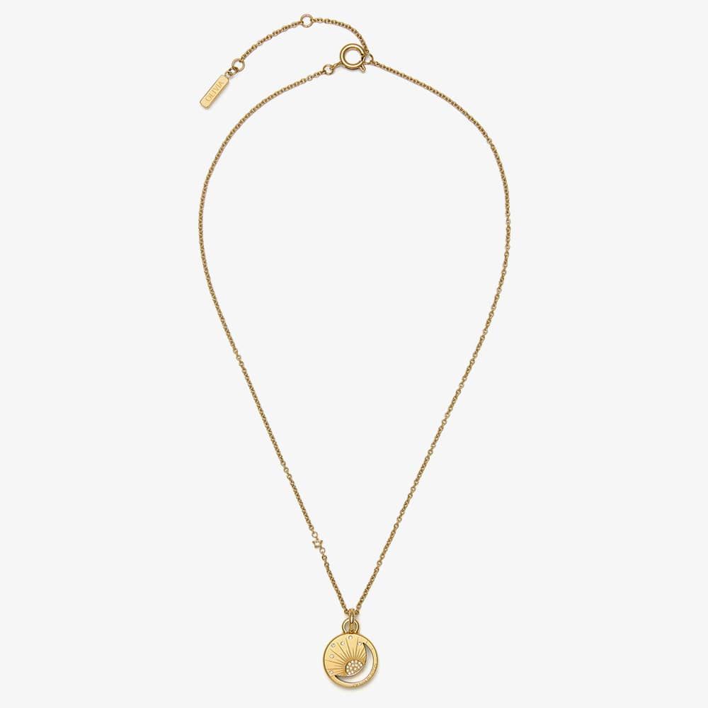 Featuring a captivating rising sun design adorned with intricate rays, it is complemented by a cut-out crescent moon and adorned with sparkling crystal stars, mirroring the sky from dawn to dusk. Completed with a delicate gold-plated chain embellished with miniature star accents, this pendant contains 22 crystals in the design.