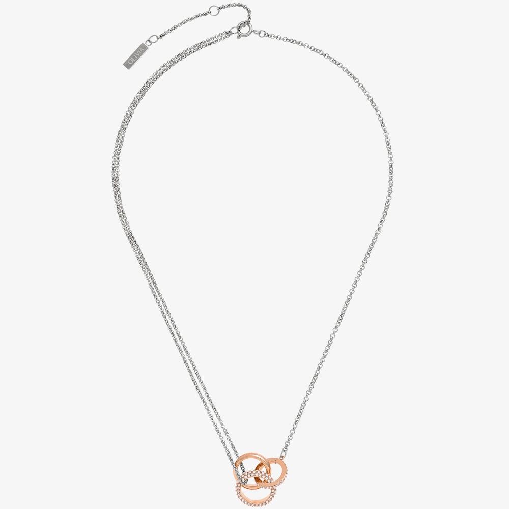 The Olivia Burton Classic Entwine Necklace 24100003 has been crafted in stainless-steel and features an elegant rose gold plated entwined three ring design embellished with sparkling crystals. This necklace is completed with a delicate belcher chain design with an adjustable bolt ring fastening. The ideal piece for layering with other Olivia Burton necklaces to create your own stacking look.