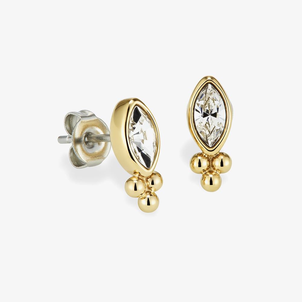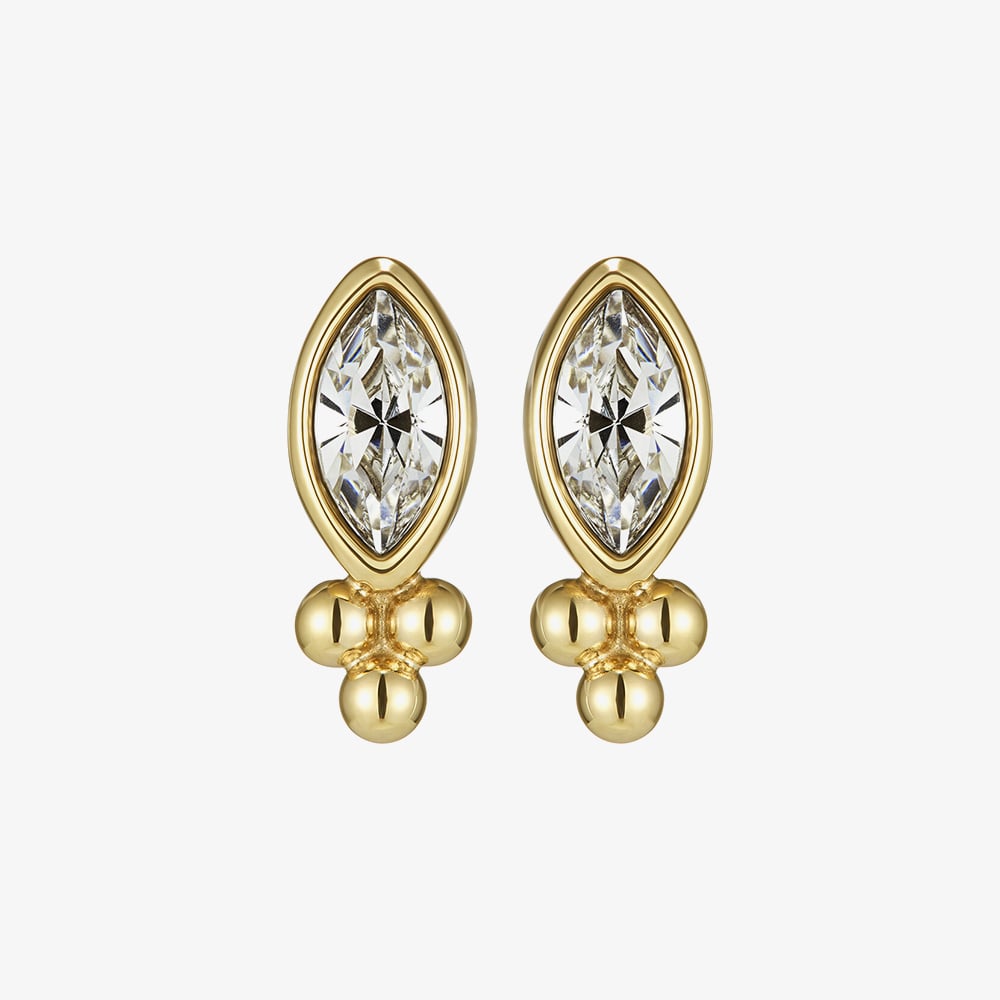 Combining vintage charm with contemporary style, these delicate gold-plated studs feature a marquise-cut Navette crystal charm adorned with three tiny caviar beads. They look stunning when stacked with the Dainty Hoop Earrings for a layered effect.