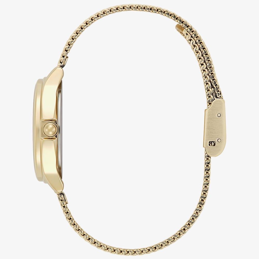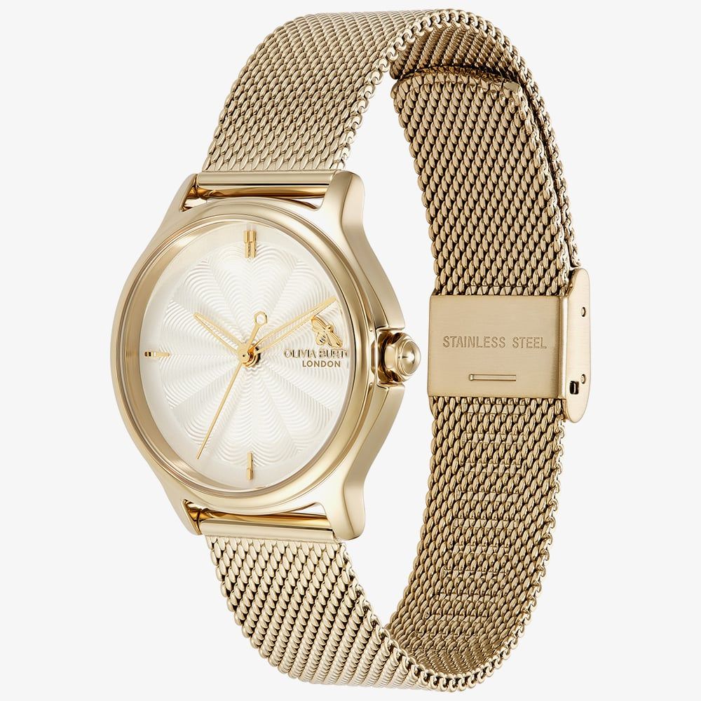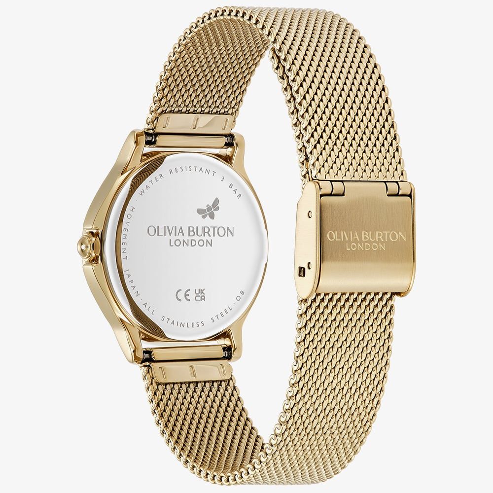 Olivia Burton 24000341 blends classic appeal with warm detailing. The 30mm gold IP case frames a silver white sunray dial, accented with gold hands, indices, and a tiny metalwork bee motif for delicate charm. The gold IP mesh bracelet adds comfort and a seamless finish, creating a watch that feels as elegant on the wrist as it looks.