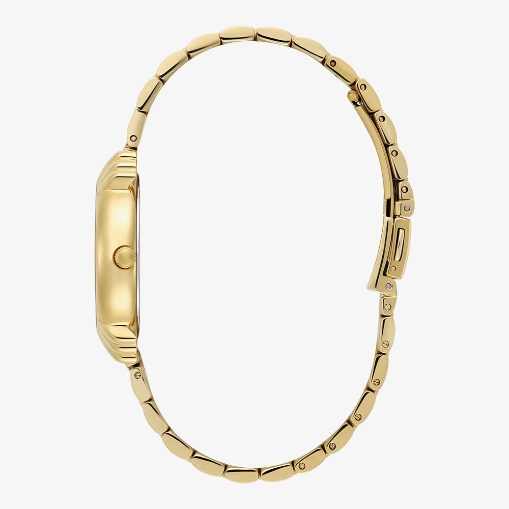 Inspired by the glamorous Art Deco era, this golden watch brings the elegance of the roaring 20s to life. The striking emerald-green dial, with its luxurious mother-of-pearl finish, is adorned with dazzling baguette crystal markers that shimmer in the light. Paying tribute to Art Deco architecture, the watch features sleek geometric fan detailing on the case, complemented by a modern bracelet strap. A captivating and opulent statement piece, it's the must-have accessory for this party season.