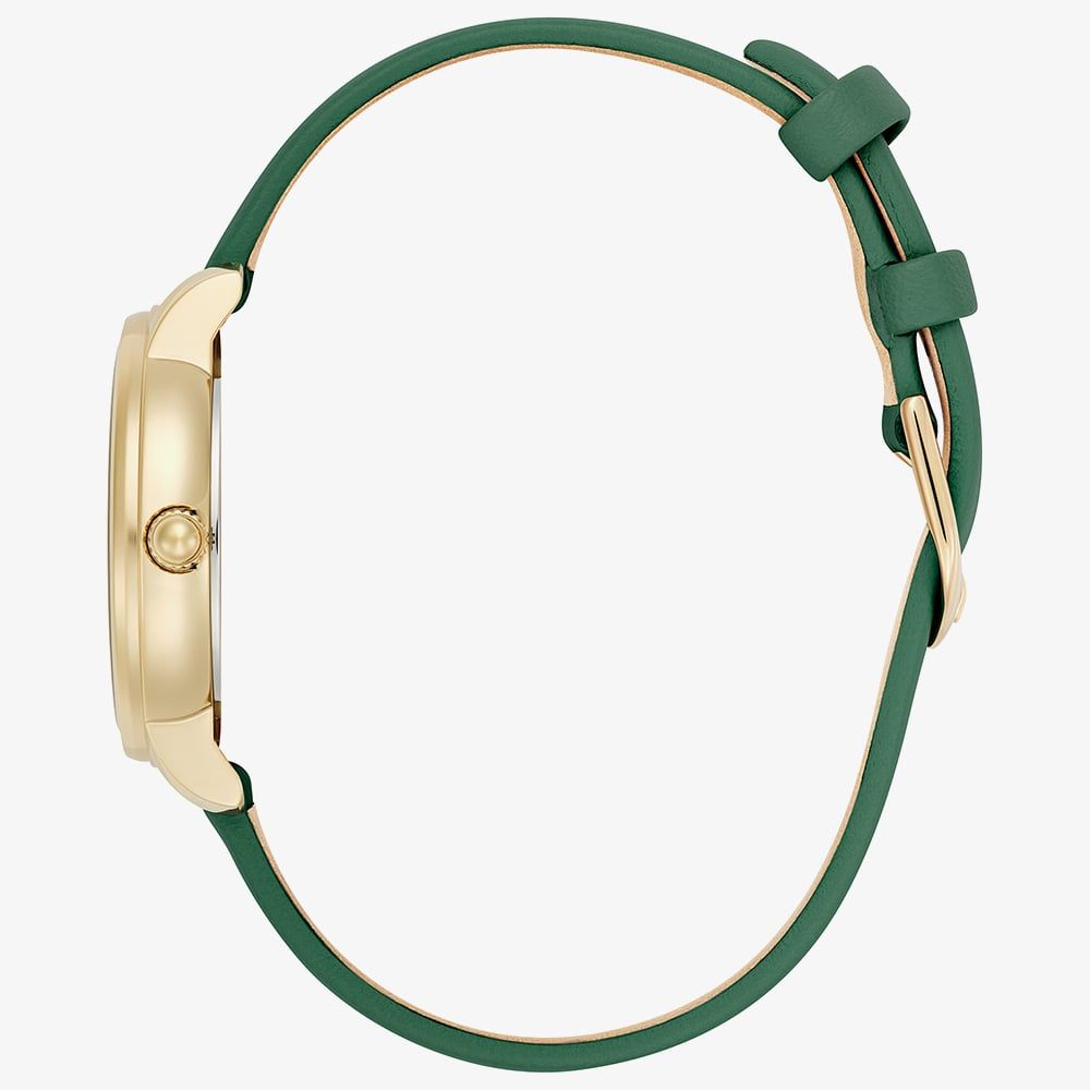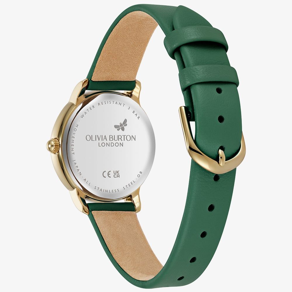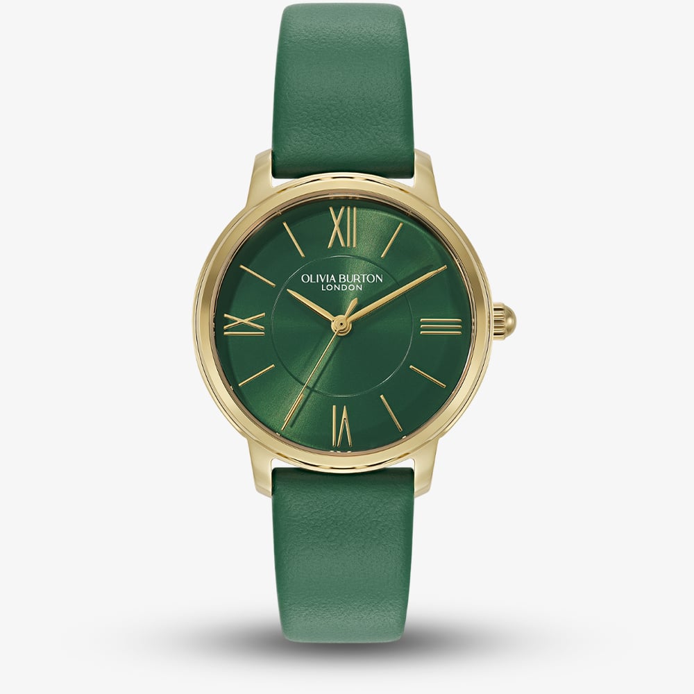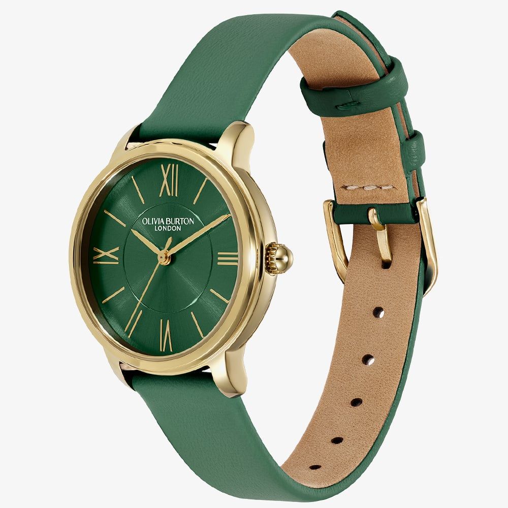 Inspired by one of London’s most charming corners, the Olivia Burton 24000352 blends timeless style with subtle contemporary flair. Its 30mm gold IP case frames a forest green sunray dial that catches the light beautifully, while the gold UP roman numerals and stick indices add understated elegance. The deep green leather strap is soft and supple, moulding comfortably to the wrist and completing a look that is both refined and approachable.