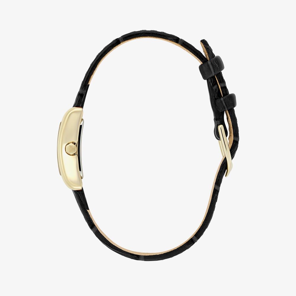 Olivia Burton reimagines their iconic Grove in a refined mini size with a bold new look. This petite rectangular watch features a sleek black dial, accented by a subtle sunray border and topped with a domed crystal for a polished finish. Gold-tone detailing adds warmth and contrast, while the gold ionic plated stainless steel case pairs elegantly with a black crocodile-effect leather strap.