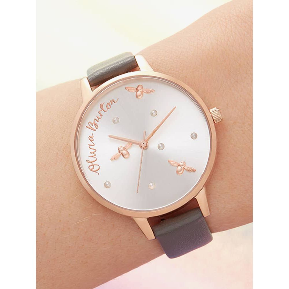 Inspired by worker bees, this stunning watch features a metallic grey dial embellished with a team of tiny rose gold bees with a scattering of faux pearls. The dial has been adorned with Olivia Burton's signature script for a unique finish. The piece is brought together with a vegan-friendly London Grey strap.