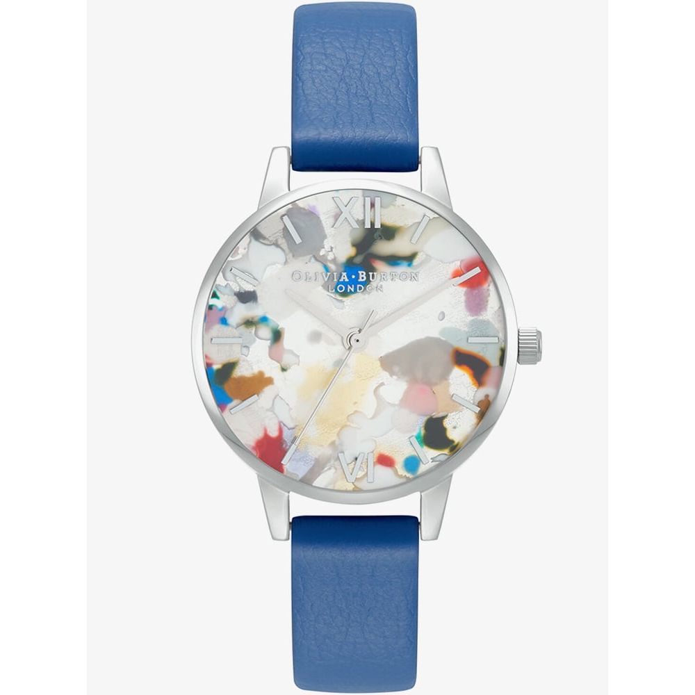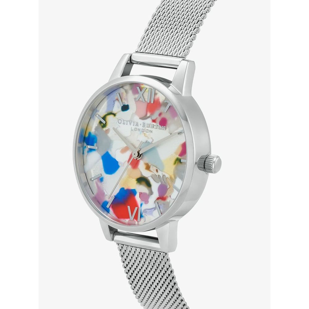 The Olivia Burton Pop Art Midi Mesh Bracelet OBGSET151 watch combines a 30mm round shaped stainless-steel case and stainless-steel mesh bracelet with a fold over clasp. It has a multi-coloured analogue dial with silver-tone hands & roman numerals which are protected beneath a mineral crystal glass. Power is generated by the quartz movement. This model also has a water resistance of up to 30 metres. This watch also comes with an eco-vegan blue material interchangeable strap. Case Depth Approx. 7.30 mm.