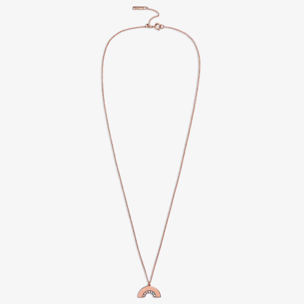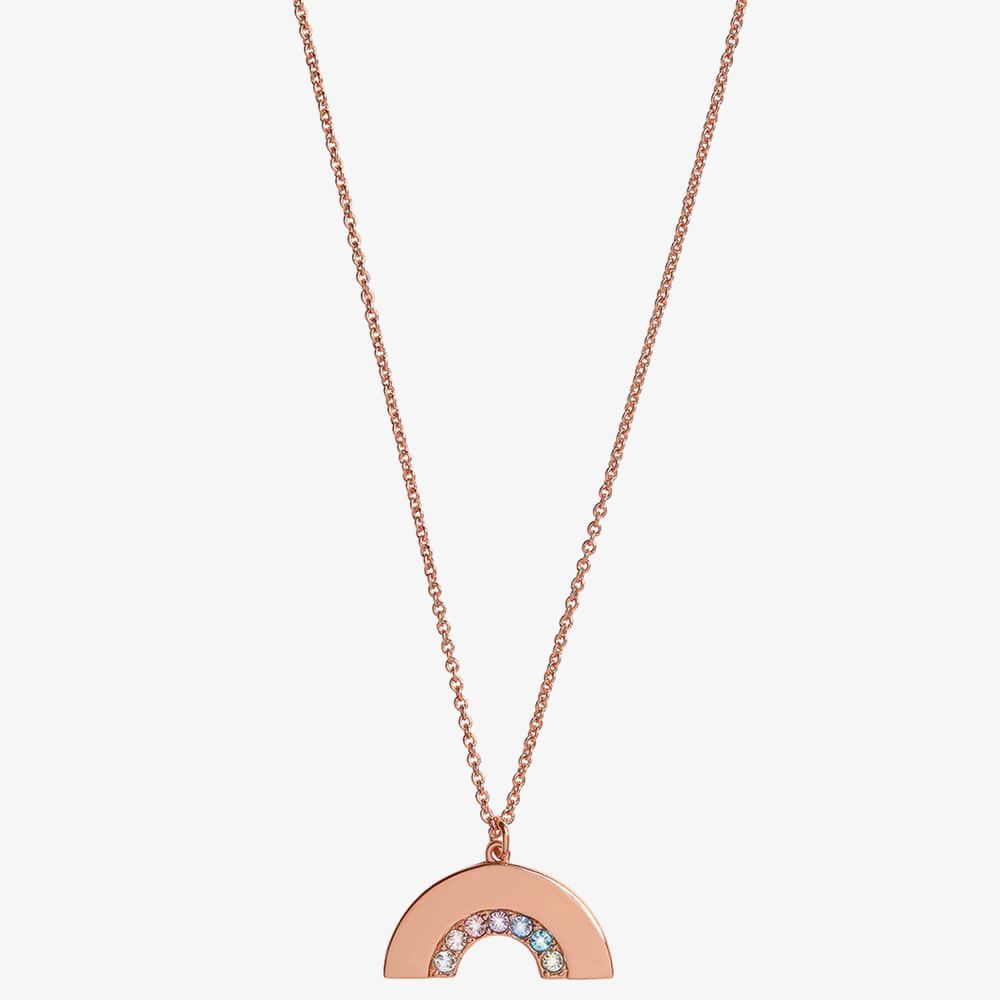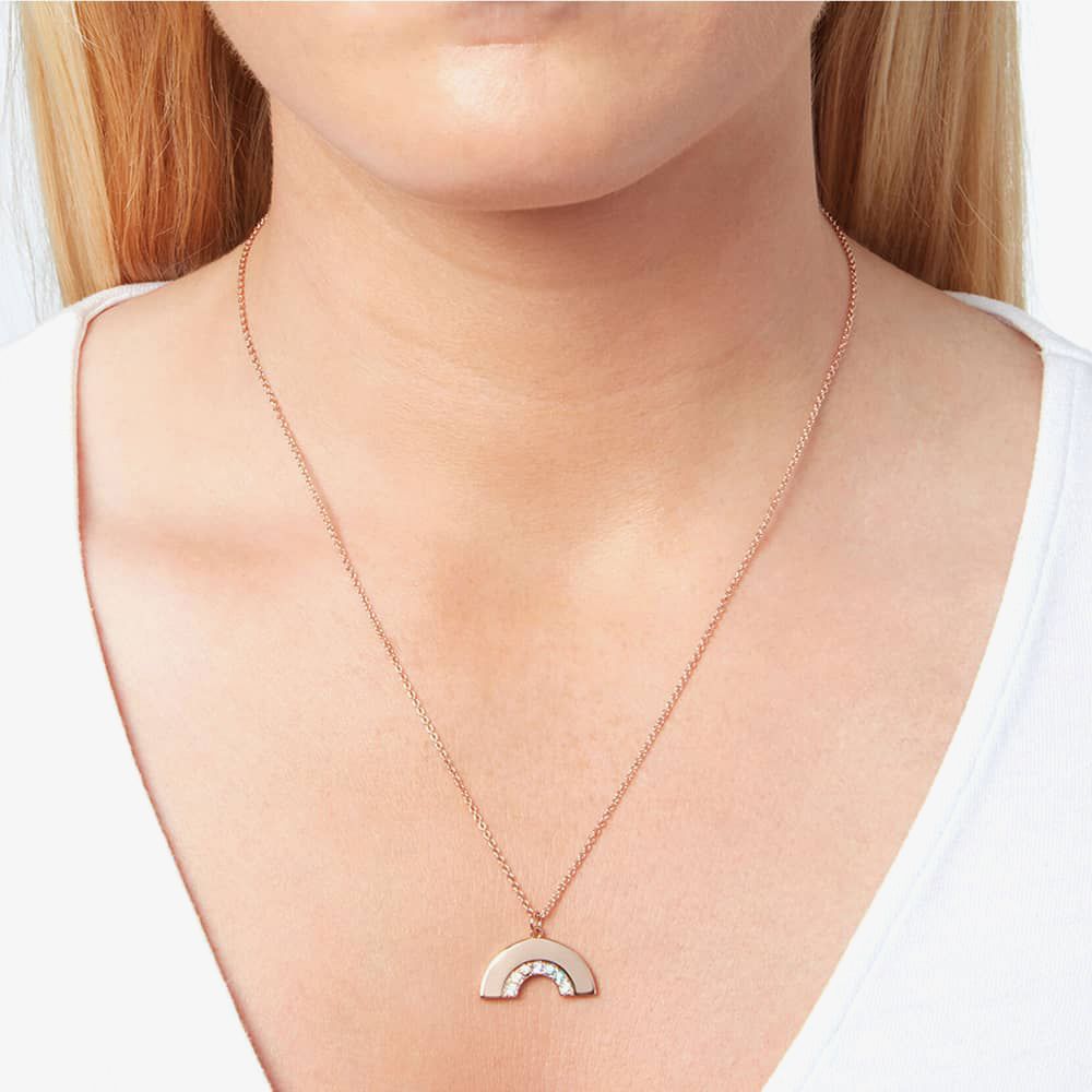 Your own personal positivity charm, this adorable rainbow necklace radiates happy vibes and is adorned with a dazzling spectrum of sustainably-sourced Swarovski crystals. The pretty rose gold plated necklace is finished with an sliding bail fastener to adjust the length to perfectly suit you. Wear alone as a sweet statement or layer with other pieces.