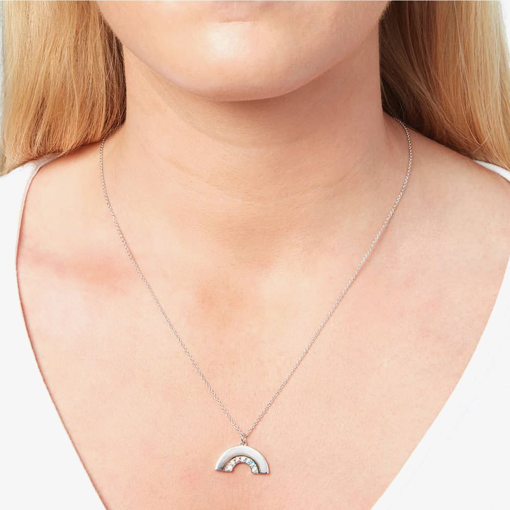 Your own personal positivity charm, this adorable rainbow necklace radiates happy vibes and is adorned with a dazzling spectrum of sustainably-sourced Swarovski crystals. The pretty silver plated necklace is finished with an sliding bail fastener to adjust the length to perfectly suit you. Wear alone as a sweet statement or layer with other pieces.