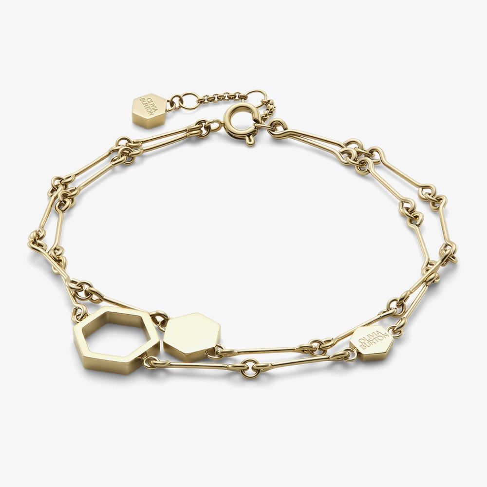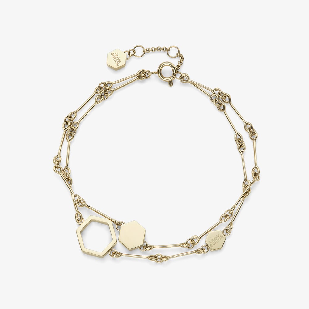 A striking addition to our honeycomb-inspired collection, this double-strand gold-plated bracelet creates an effortless layered look in one piece. Featuring hexagonal charms on a vintage-inspired bar chain, it’s perfect for those who love bold jewellery that shines from day to night.