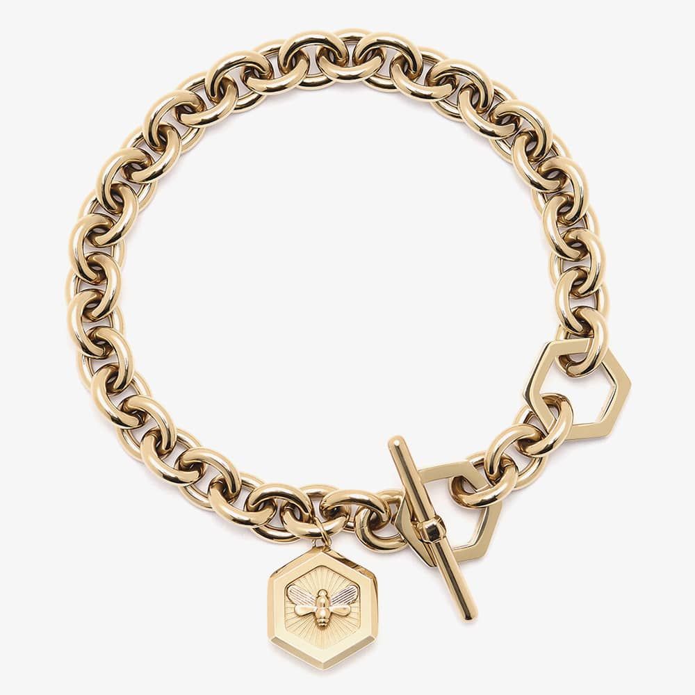 Bold and contemporary, the Minima Bee and Honeycomb T-Bar Bracelet offers a fresh and stylish approach to showcasing the beloved bee motif. Drawing inspiration from beehives, this stainless-steel geometric pendant displays a petite bee. The chunky gold-plated T-Bar chain adds a trendy touch and can be easily adjusted for a perfect fit.