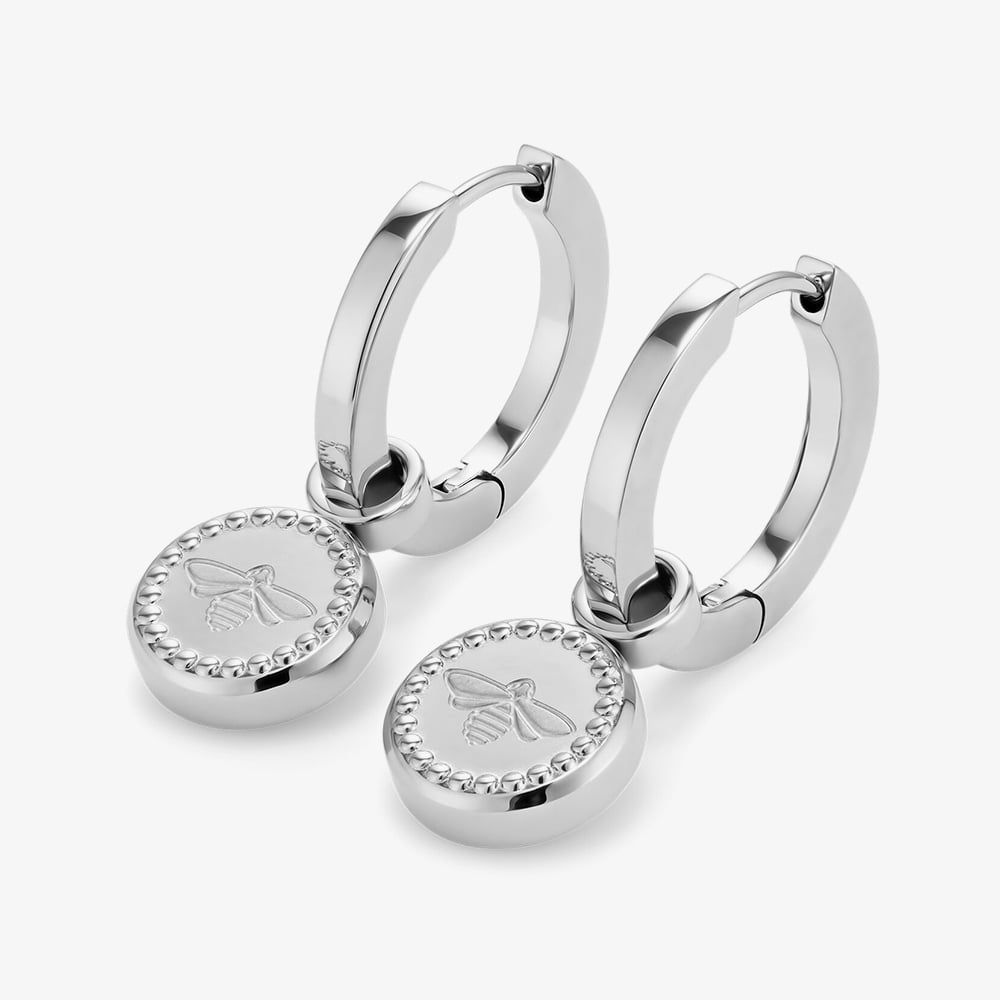 Prepare to be charmed by our vintage-inspired collection. These hoop earrings feature antique-inspired silver-tone disc charms, each showcasing a playful bee with a caviar-beaded border. Etched on the reverse for a hidden surprise, the removable charms offer versatile styling options.