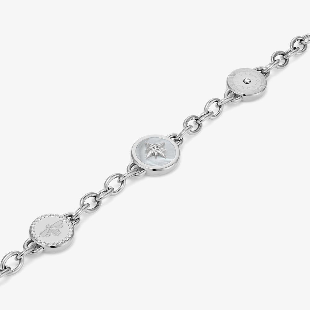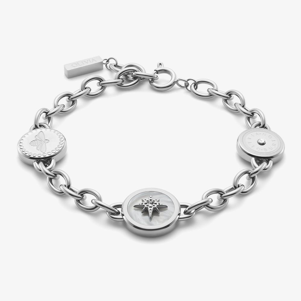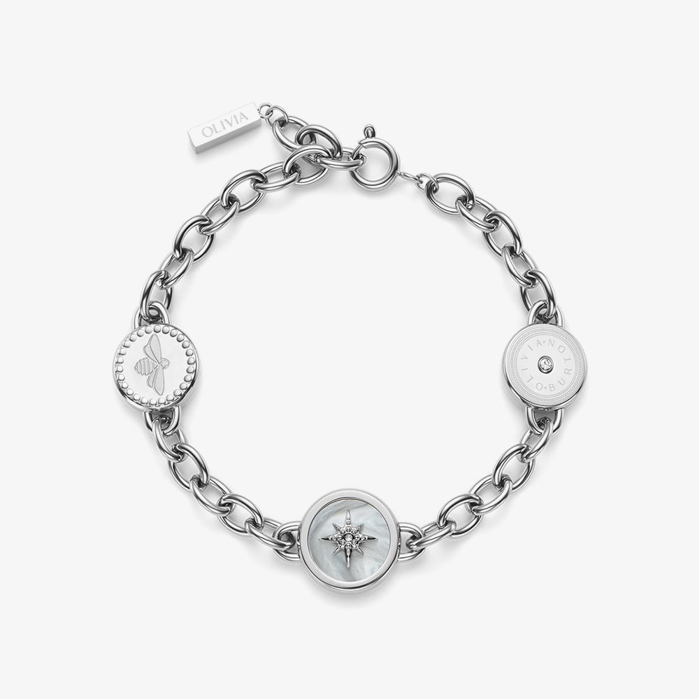 Prepare to be charmed by our vintage-inspired collection. This silver-tone bracelet showcases three beautifully detailed charms—a playful bee, a North Star on faux mother-of-pearl, and a crystal-set disc with ribbon etching. Paired with a bold gold-plated chain, it’s perfect for making a statement or layering with other pieces.