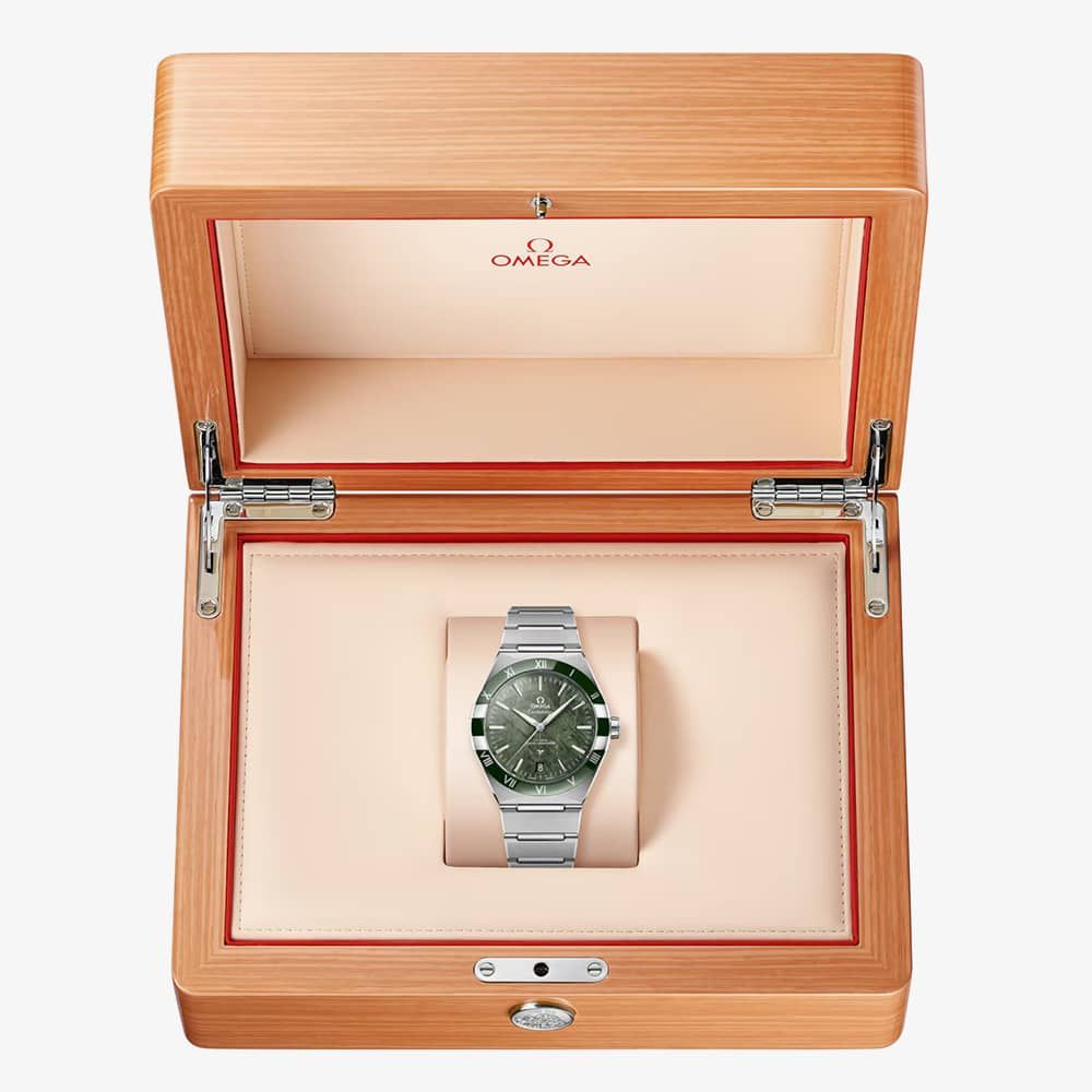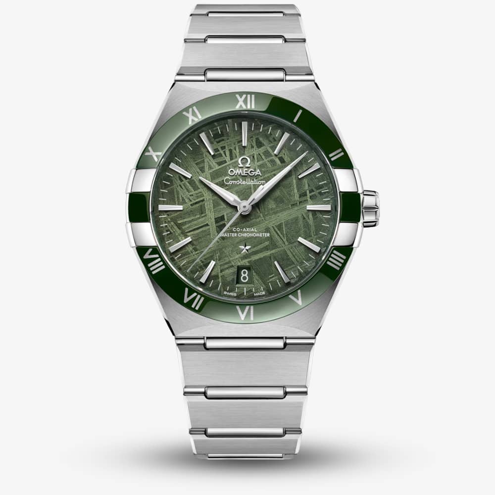The OMEGA Constellation, known for capturing the essence of celestial motion since 1952, takes its stellar inspiration to new heights with this captivating meteorite dial model. Crafted from stainless steel, the 41mm timepiece boasts classic Constellation design elements – polished claws, half-moon facets, and Liquidmetal Roman numerals circling a green ceramic bezel. The true star of the show, however, is the mesmerising dial. Forged from a genuine piece of iron meteorite and boasting a unique green hue, the dial's natural patterns ensure no two watches are identical. Completing the look are 18ct white gold hands, indexes, a date window at 6 o'clock, and the iconic Constellation star.