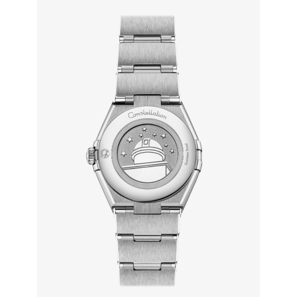 The Omega constellation 131.10.28.60.03.001 watch combines a 28mm round shaped stainless steel case and silver stainless steel bracelet with a push button deployment clasp. It has a blue analogue dial which is protected beneath sapphire crystal glass. Power is generated by the quartz movement. This model also has a water resistance of up to 30 metres.
