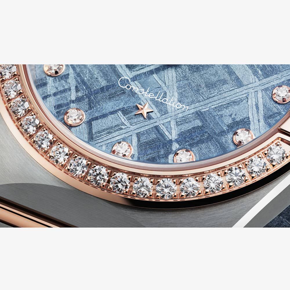 The remarkable dial is fashioned from genuine iron meteorite, treated to impart a mesmerising blue hue. Each dial bears a unique natural pattern inherent to the meteorite, ensuring individuality for each watch. Enhanced with diamond hour markers and a Constellation star crafted from 18K Sedna™ Gold, the dial exudes elegance.