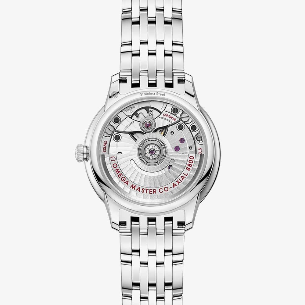 The OMEGA 434.10.34.20.07.001 watch combines a 34mm round shaped stainless-steel case and silver stainless steel bracelet with a push button deployment clasp. It has a grey mother of pearl analogue dial with date display which is protected beneath domed scratch resistant sapphire crystal glass with anti-reflective treatment on both sides. Power is generated by the chronometer certified OMEGA Co-Axial calibre 8800 automatic movement and has a power reserve of 55 hours. This model also has a water resistance of up to 30 metres.
