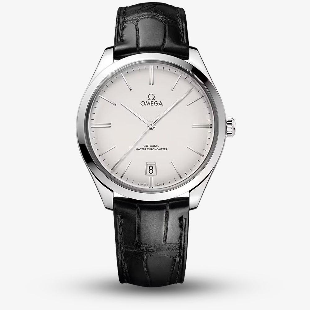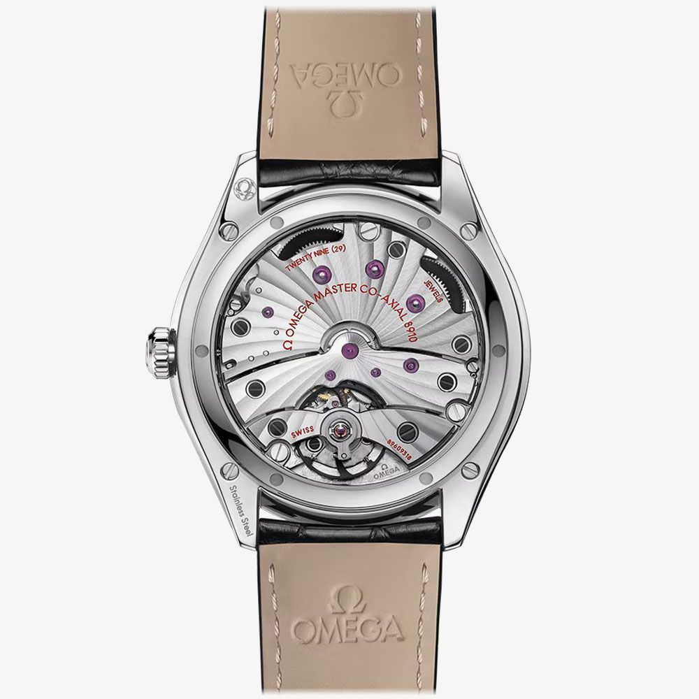 An OMEGA De Ville watch composed of a 40mm stainless steel case and black leather strap. Protecting the silver dial is scratch resistant sapphire crystal glass with an anti-reflective treatment applied to both sides. The dial has a date display and 18k white gold hands and indexes, with power generated by the OMEGA Co-Axial Master Chronometer Calibre 8910, a manual winding movement certified at the industry's highest standard of precision, chronometric performance, and magnetic resistance, which can be seen through the transparent case back. The movement is also resistant to magnetic fields reaching 15,000 gauss and has a 72 hour power reserve.