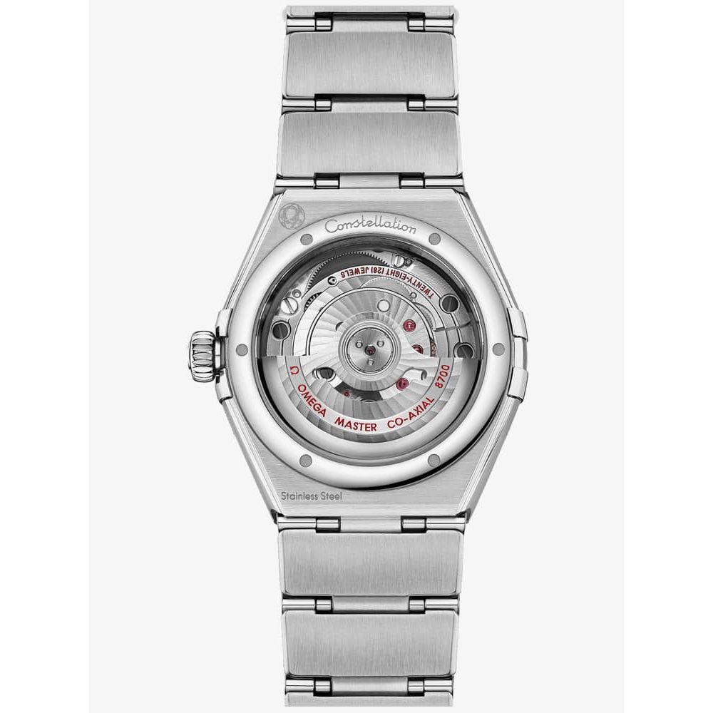 The OMEGA 131.10.29.20.56.001 Constellation watch combines a 29mm round shaped stainless steel case and bracelet with a push button clasp. It has a grey analogue dial with 18k white gold Super-LumiNova filled hands and diamond hour markers which is protected beneath domed scratch resistant sapphire crystal glass with an anti-reflective treatment on both sides. Power is generated by the Co-Axial Master Chronometer Calibre 8700 automatic movement with 28 jewels and a power reserve of up to 50 hours. This model also has a diamond set bezel, a transparent case back, and a water resistance of up to 50 metres.