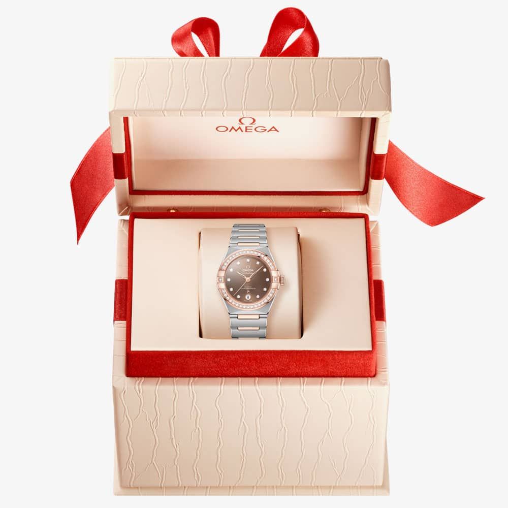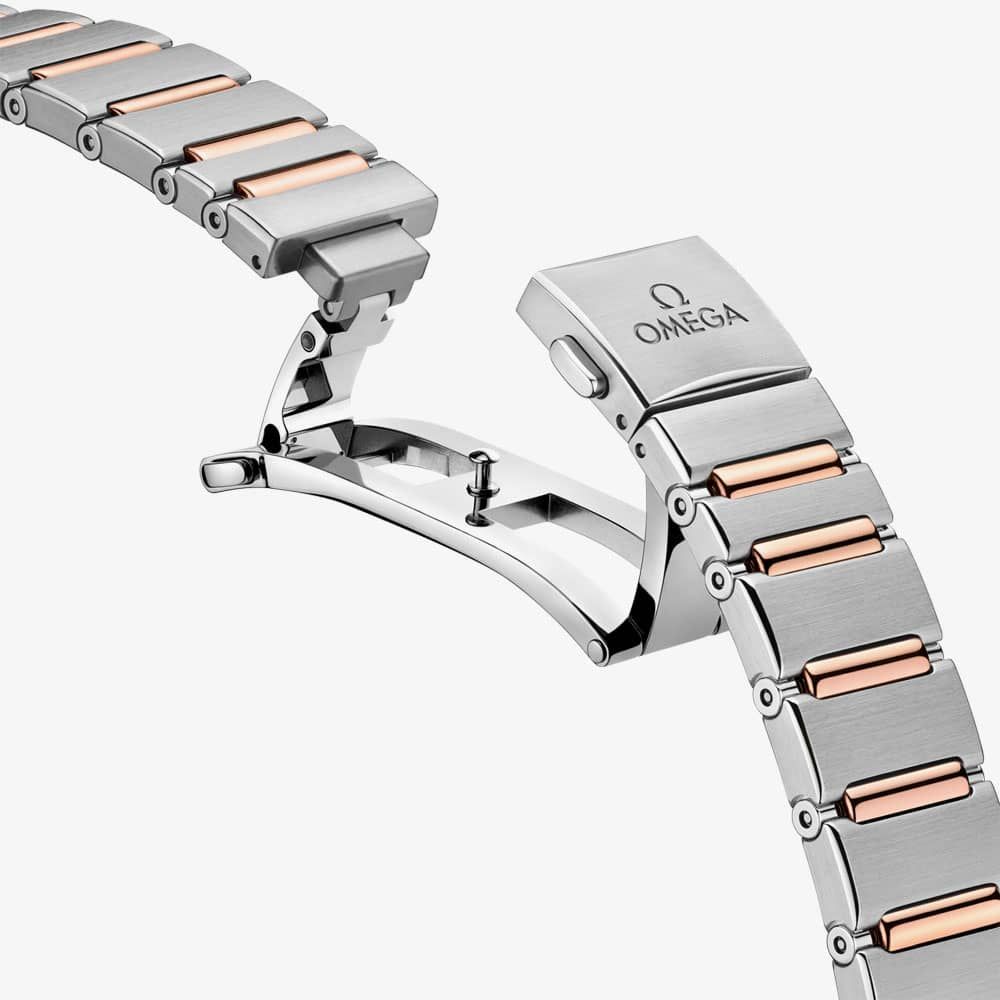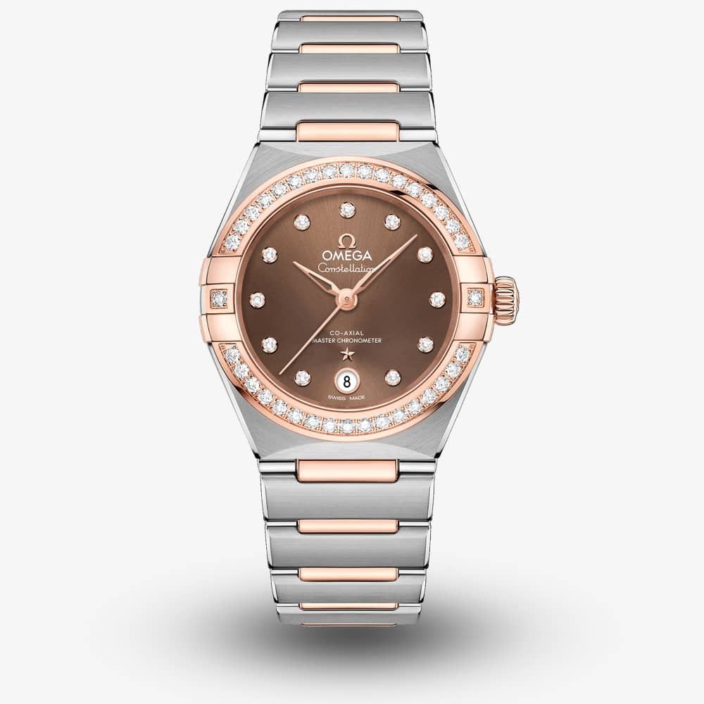 Crafted with a dramatic and enduring design, the OMEGA Constellation is characterised by its famous half moons, claws on the case and a mono-rang bracelet. This beautiful model features a brushed brown dial adorned with diamond hour markers and a date window at the 6 o'clock position. Contrasting 18ct Sedna gold constellation star, indexes, diamond holders and an OMEGA logo. The watch dial is finished with domed scratch-resistant sapphire crystal glass, visible OMEGA Co-Axial Master Chronometer Calibre 8700 and an 18ct Sedna gold plated diamond-set bezel.