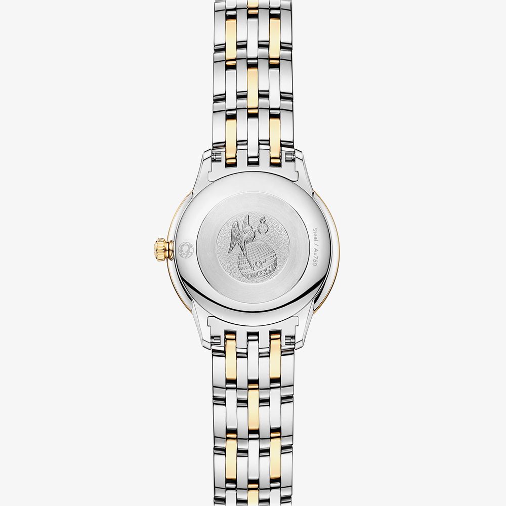 The OMEGA 434.20.28.60.08.001 De Ville Prestige watch combines a 28mm round-shaped 18ct yellow gold stainless steel case and bracelet with a fold-over clasp. It has a PVD Moonshine gold analogue dial with a sun-brushed finish featuring yellow gold-plated hands and indexes protected beneath domed,
