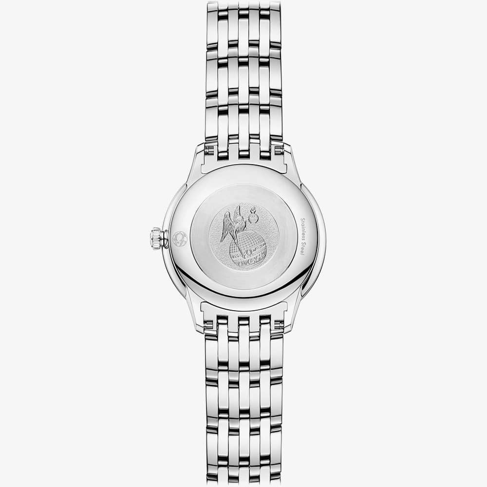 The OMEGA 434.10.28.60.09.001 De Ville Prestige watch combines a 28mm round-shaped stainless steel case and silver stainless steel bracelet with a fold-over clasp. It has a linen beige sun-brushed textured analogue dial with rhodium-plated hands and indexes, protected beneath domed, scratch‑resistant sapphire crystal with anti‑reflective treatment inside. Power is generated by the OMEGA 4061 Swiss quartz movement with an approximate battery life of 48 months. This model also has a water resistance of up to 30 metres.