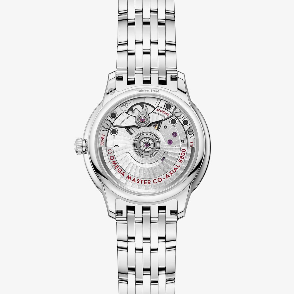 The OMEGA 434.10.34.20.10.001 watch combines a 34mm round shaped stainless-steel case and a silver stainless steel bracelet with a fold over clasp. It has a green analogue dial with a date display and 18k yellow gold hour markers, which is protected beneath domed scratch resistant sapphire crystal glass with anti-reflective treatment on both sides. Power is generated by the chronometer certified OMEGA Calibre 8800 automatic movement and has a power reserve of 55 hours. This model also has a water resistance of up to 30 metres.