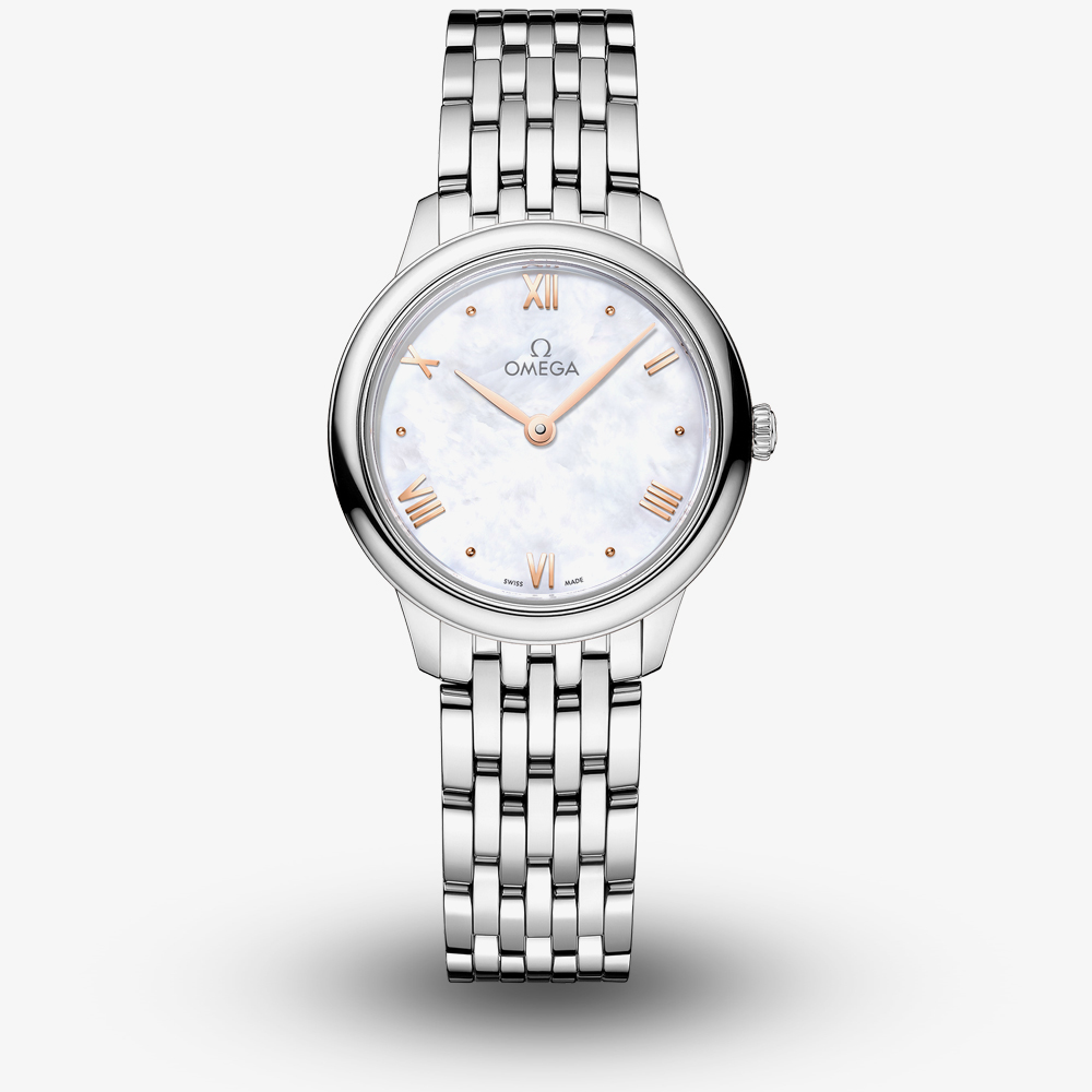 The OMEGA 434.10.28.60.05.001 watch combines a 28mm round-shaped stainless steel case and silver stainless steel bracelet with a fold-over clasp. It has a white mother-of-pearl analogue dial with PVD Sedna rose gold hands in indexes, protected beneath domed, scratch-resistant sapphire crystal glass with anti-reflective treatment.