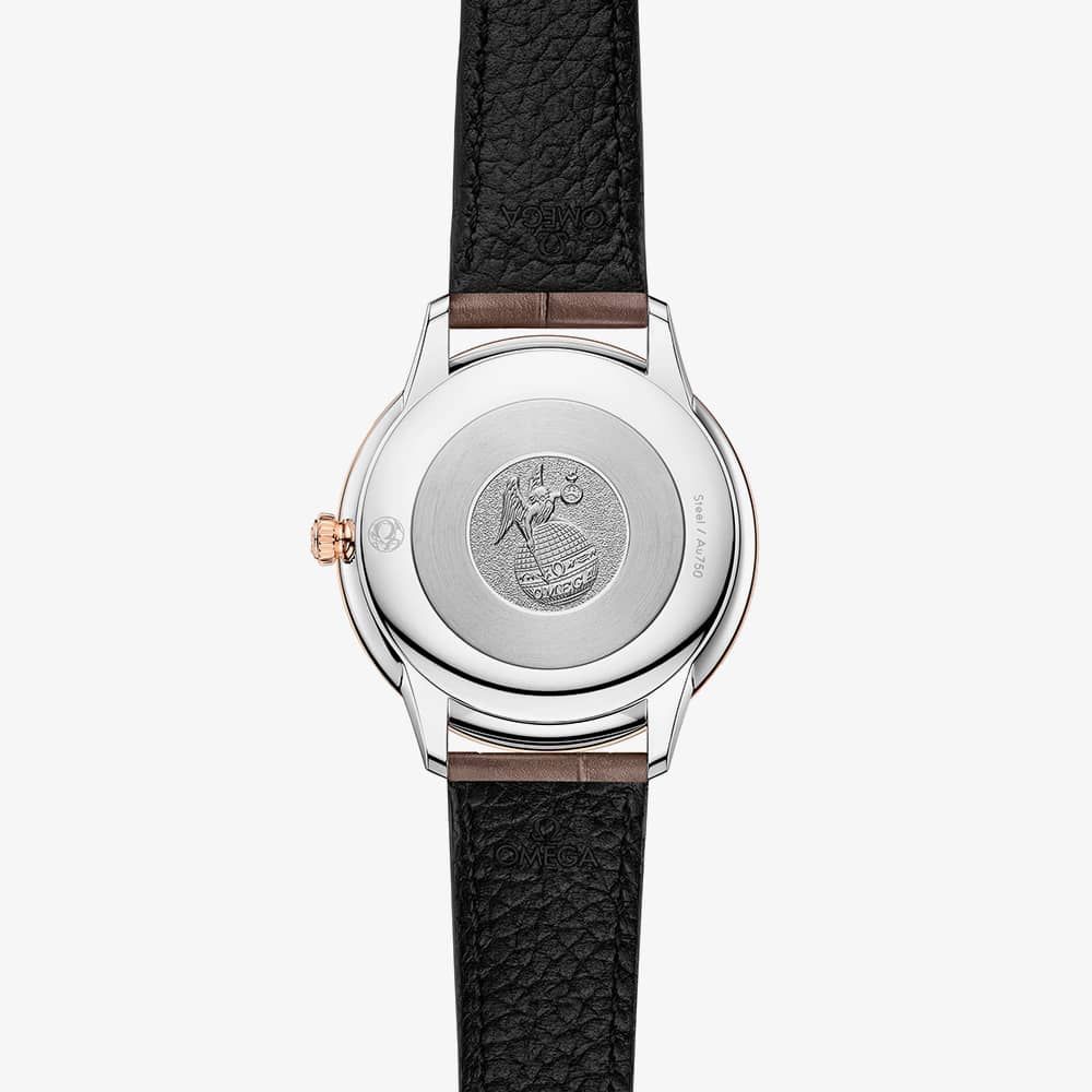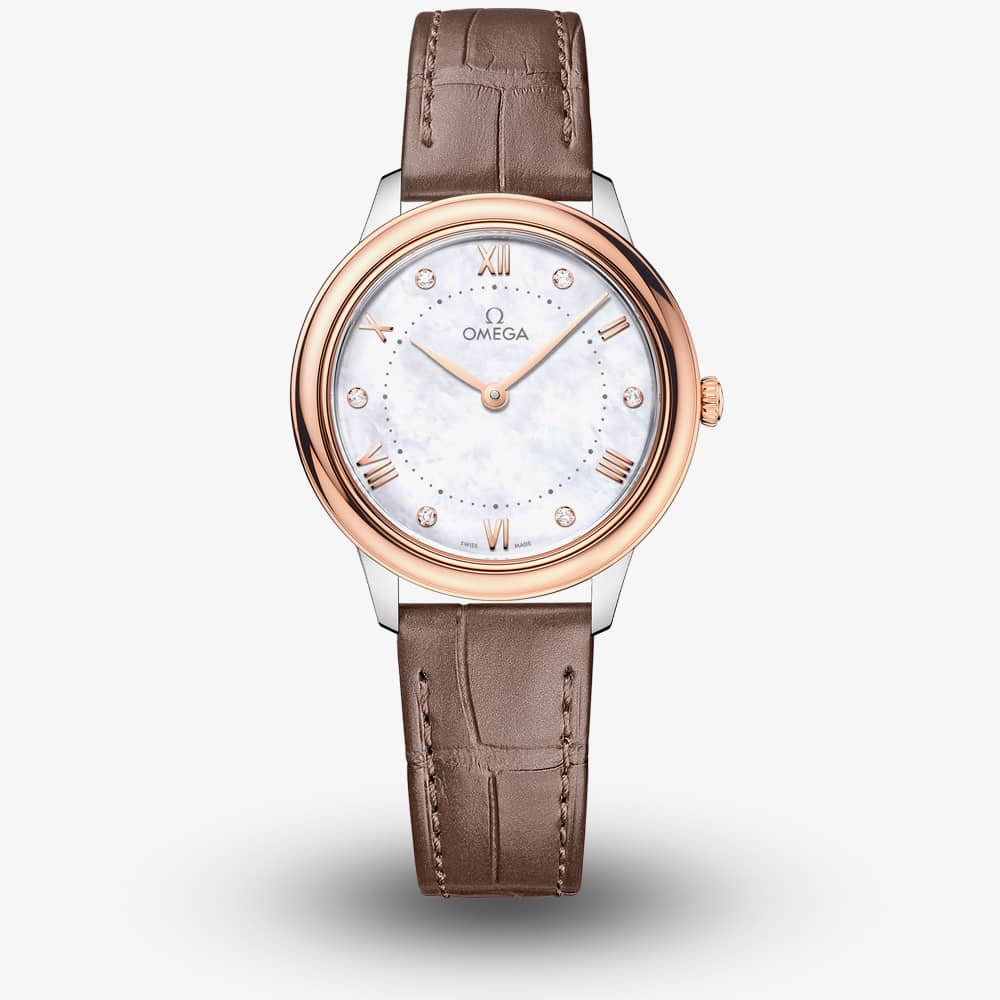 The OMEGA 434.23.30.60.55.001 watch combines a 30mm round shaped 18ct Sedna rose gold case and brown leather strap with a traditional buckle. It has a mother of pearl analogue dial, 18ct Sedna Rose Gold hands and diamond hour markers, which is protected beneath domed scratch resistant sapphire crystal glass with anti-reflective treatment on both sides. Power is generated by the OMEGA calibre 4061 “long life” quartz movement. This model also has a water resistance of up to 30 metres.