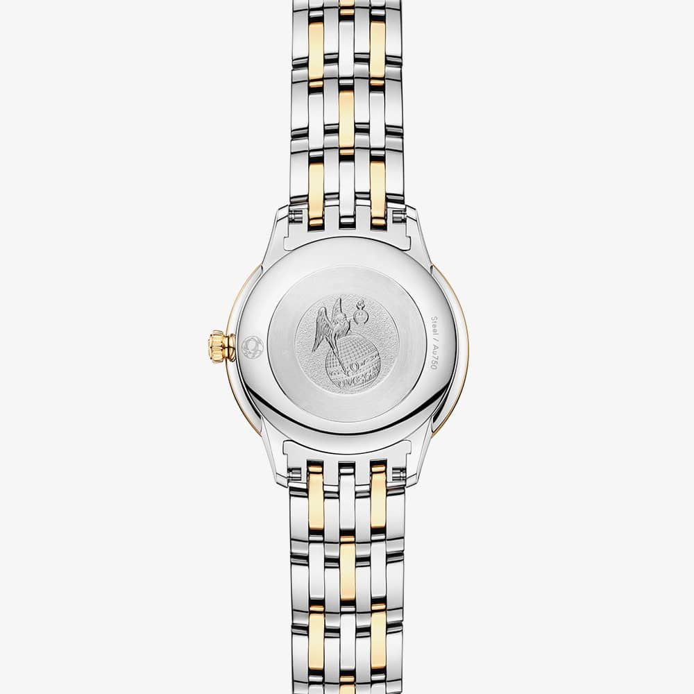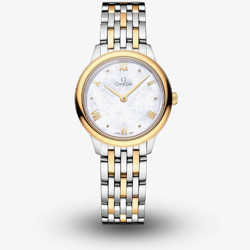 The OMEGA 434.20.28.60.05.001 watch combines a 27mm round shaped 18k gold case and two-colour 18k yellow gold and stainless-steel bracelet with a fold over clasp. It has a mother of pearl analogue dial and also features 18k yellow gold hour markers and hour hand. Dial is protected beneath domed scratch resistant sapphire crystal glass with anti-reflective treatment. Power is generated by the OMEGA 4061 “long life” quartz movement. This model also has a water resistance of up to 30 metres.